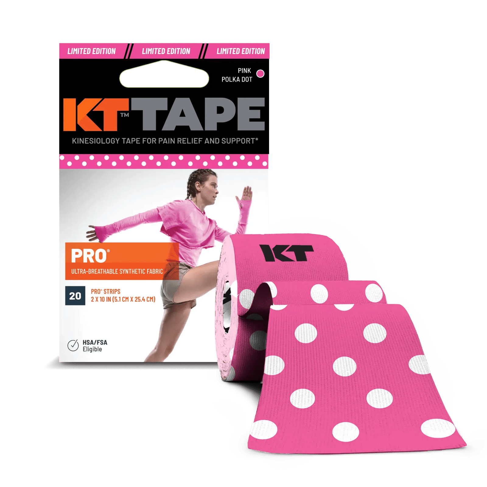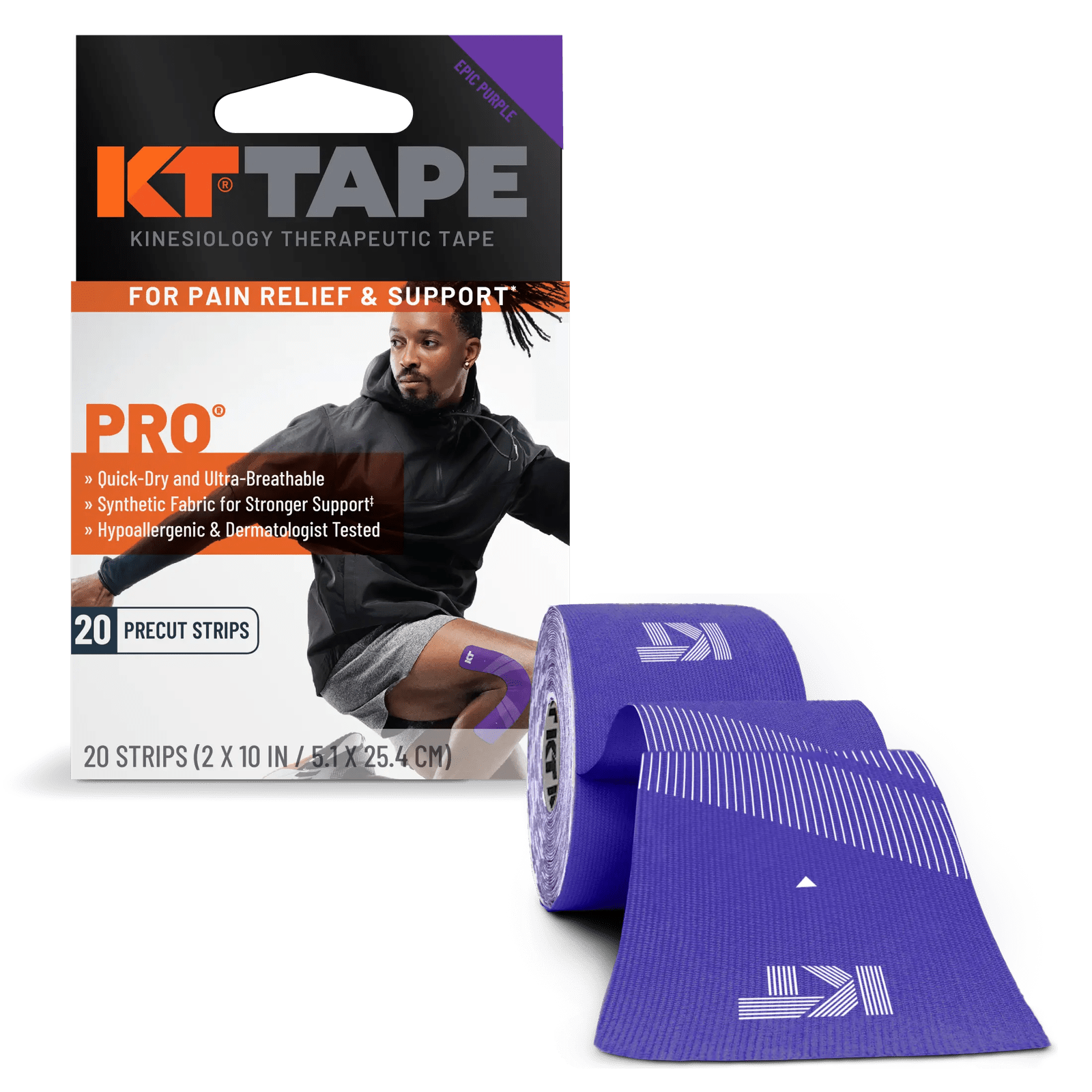 KT Tape Pro® is pre-cut athletic tape and ready to apply right out of the box. Pre-cut strips have rounded corners which help to prevent the corners from catching on clothing or the edges fraying. Each roll contains 20 pre-cut strips that are 10 inches long and 2 inches wide.