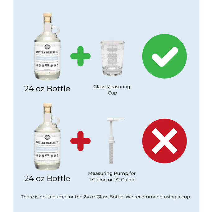 This pump fits our 1/2 Gallon Plastic Jugs (64 oz) only. These pumps dispense a full 1oz when fully charged. The exact amount for a medium load of laundry.+