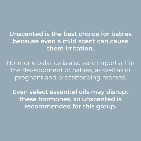 Why Unscented? Unscented is the best choice for babies because even a mild scent can cause them irritation. Hormone balance is also very important in the development of babies, as well as in pregnant and breastfeeding mamas. Even select essential oils may disrupt these hormones, so unscented is recommended for this group. This is not yet mainstream knowledge, so that is why we re-labeled our popular Unscented Laundry Detergent to help mindful mamas make great choices.