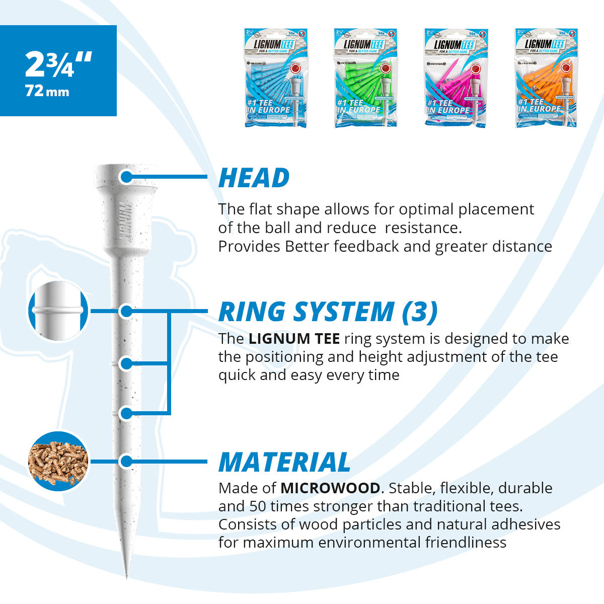 Lignum Tees are manufactured in Europe and is recommended by over 5 Million golfers for consistent tee height for a better game. Their smooth and soft profiling ensures comfort as well as no damage to any material that is used in turf maintenance.