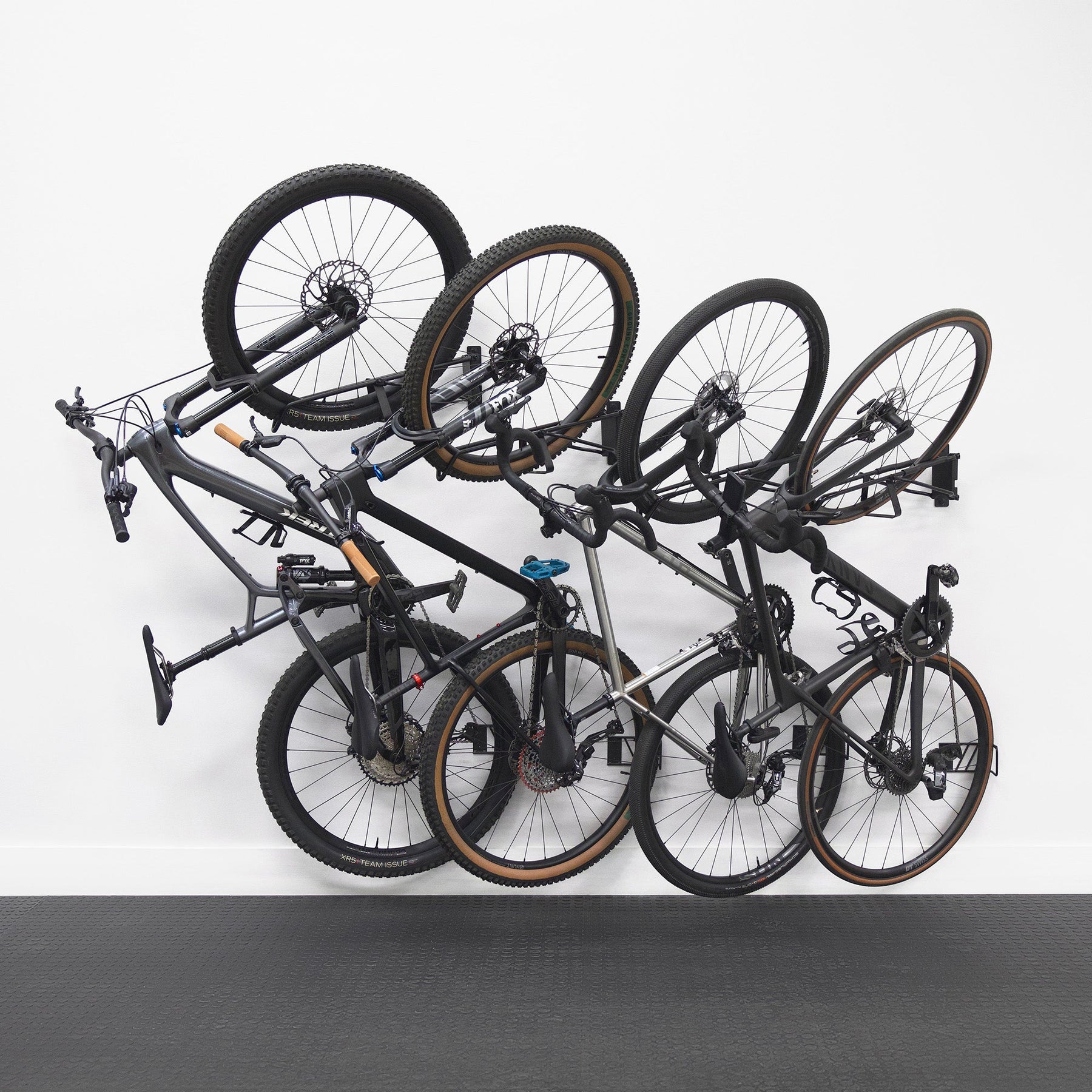 Roll right into storage—no lifting required. This solid steel rack maximizes space with a patent-pending handlebar tilt, ensuring compact parallel mounting that eliminates contact between neighboring bikes.