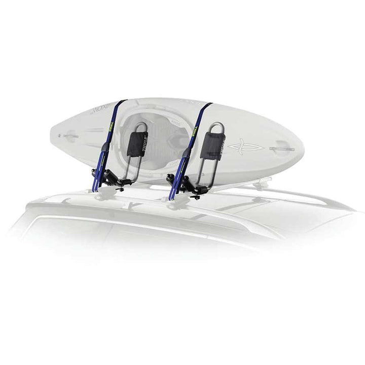 Proven J-style kayak carrier creates more room on the load bar to transport more toys at the same time