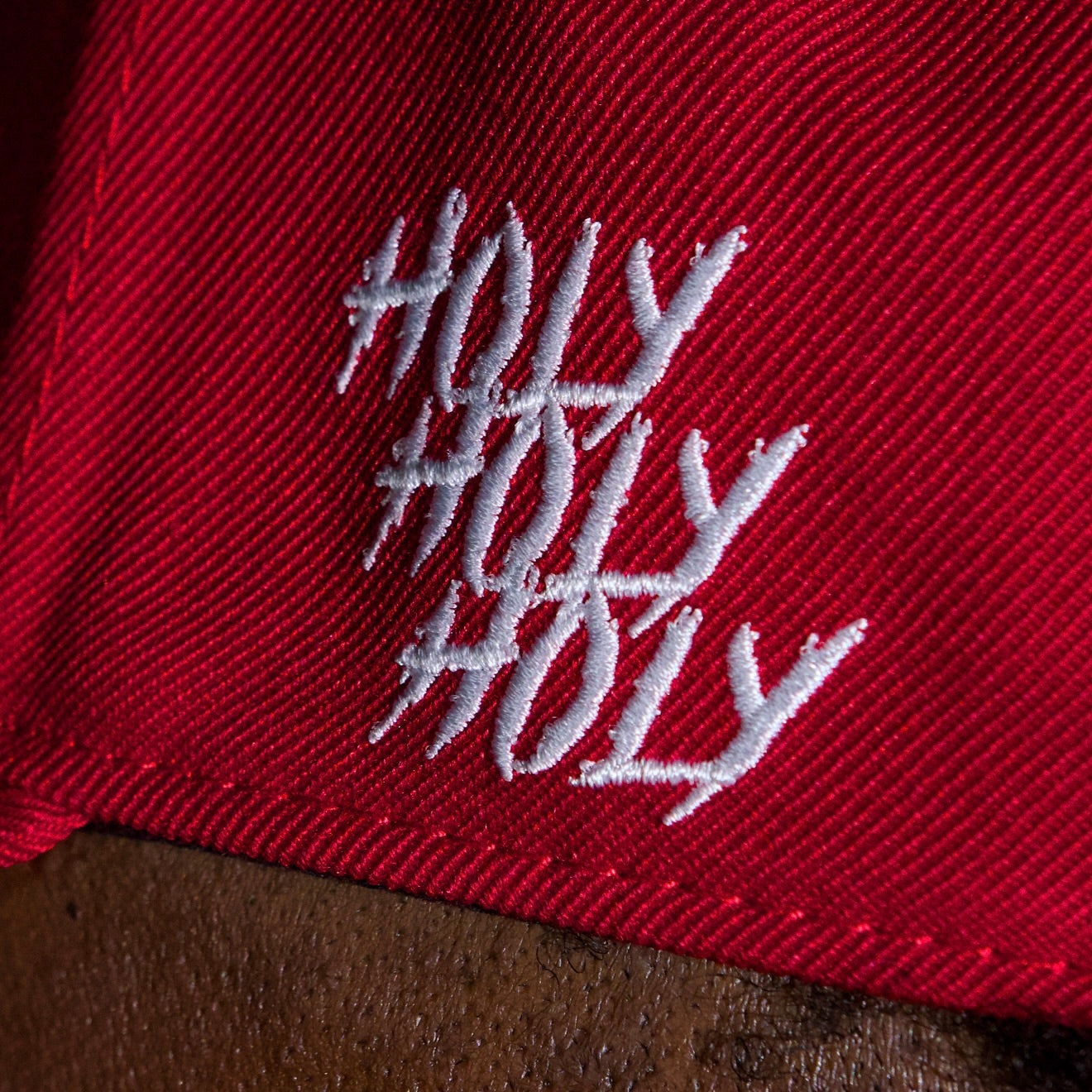 Left Panel: “HOLY HOLY HOLY” embroidery (Rev. 4:8).