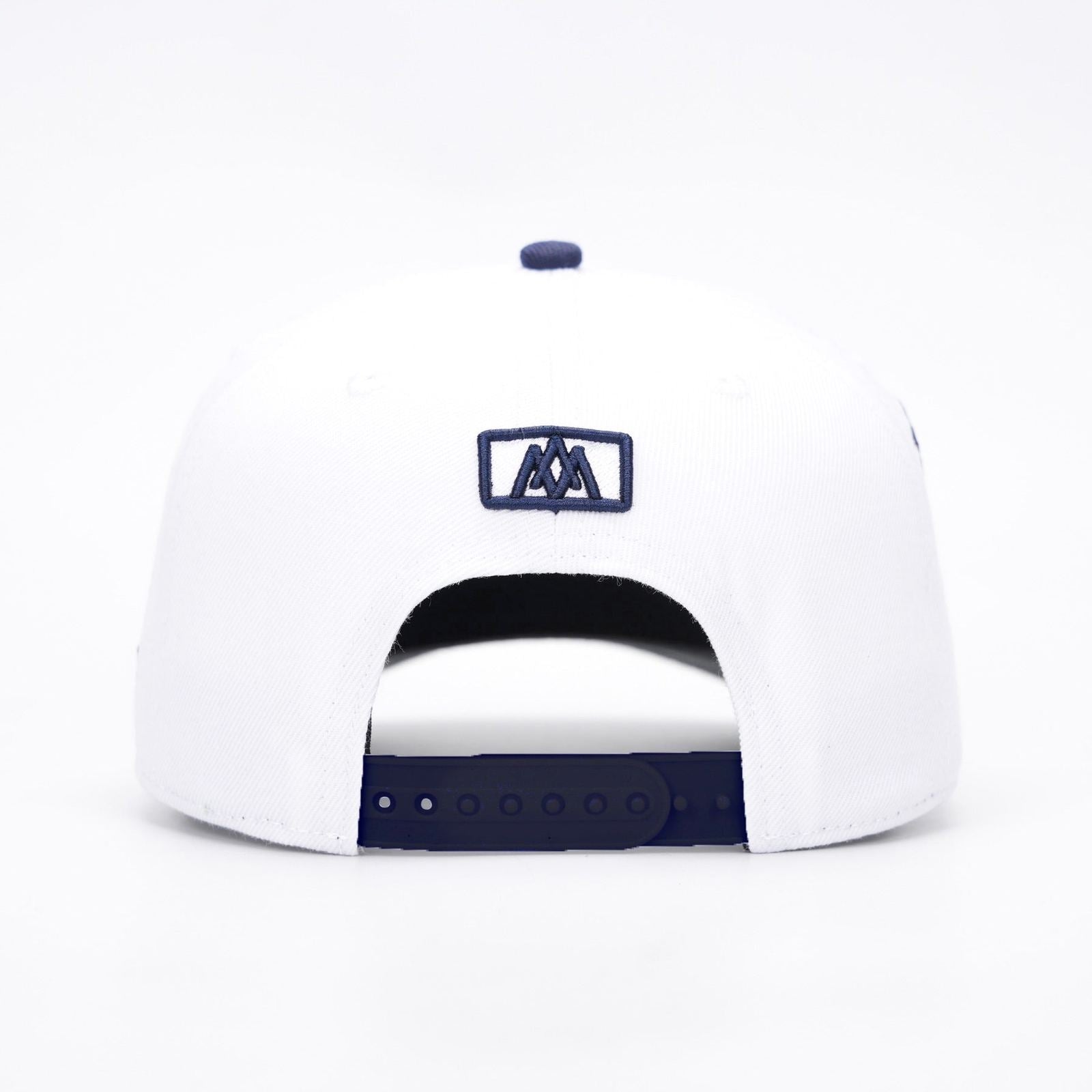 Back: Boxed-in Malta Apparel ‘MA’ Logo puff embroidery above navy plastic snap strap.