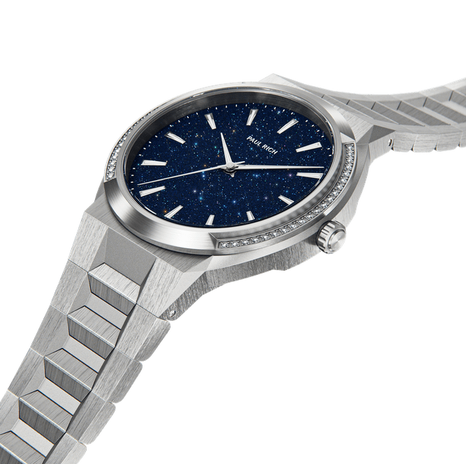 A monochromatic wonder. The Cosmic Dust timepiece for women boasts 42 cupid-cut rhinestones that beautifully reflect the light, giving the timepiece a dazzling shine and an air of sophistication that can’t be beat. This model has a stunning aventurine dial that looks like the night sky and will captivate anyone who sees it.
