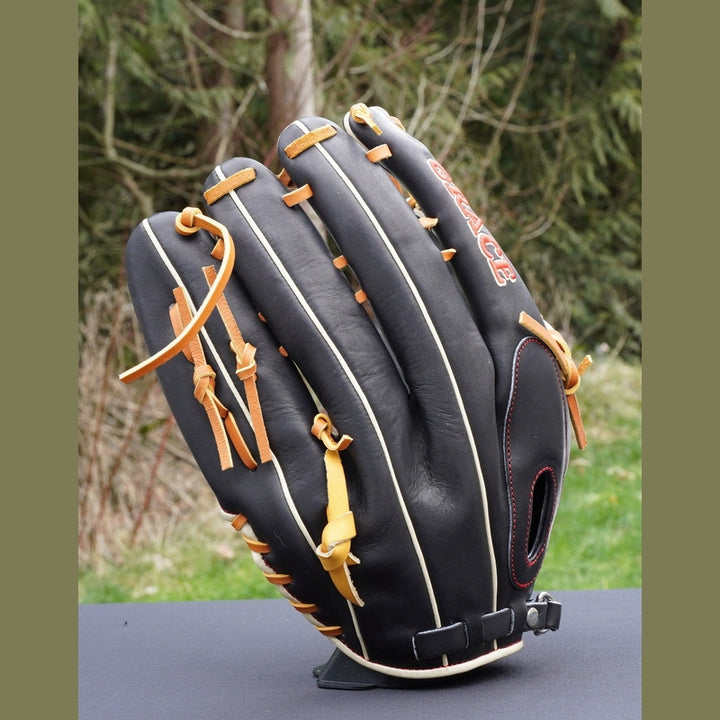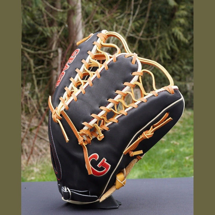 Unleash your potential with the 12.75" Outfield H-Web Baseball Glove, a true game-changer. Featuring a six finger shell and a striking black, red and tan design, this glove seamlessly blends fashion with utility. Let your inner outfielder shine and elevate your performance with exhilaration and assurance.
