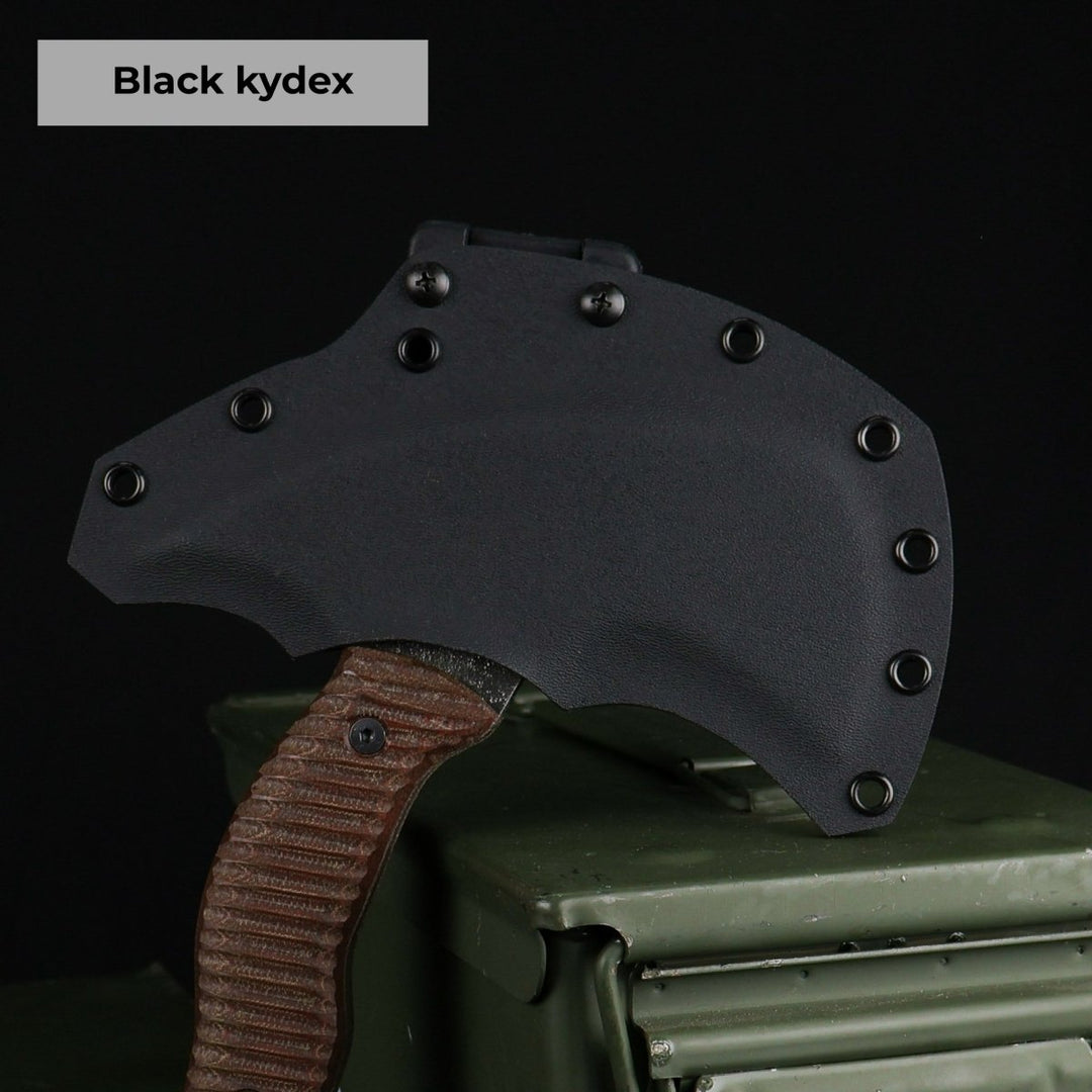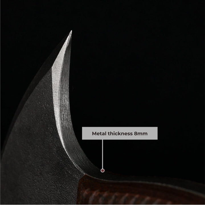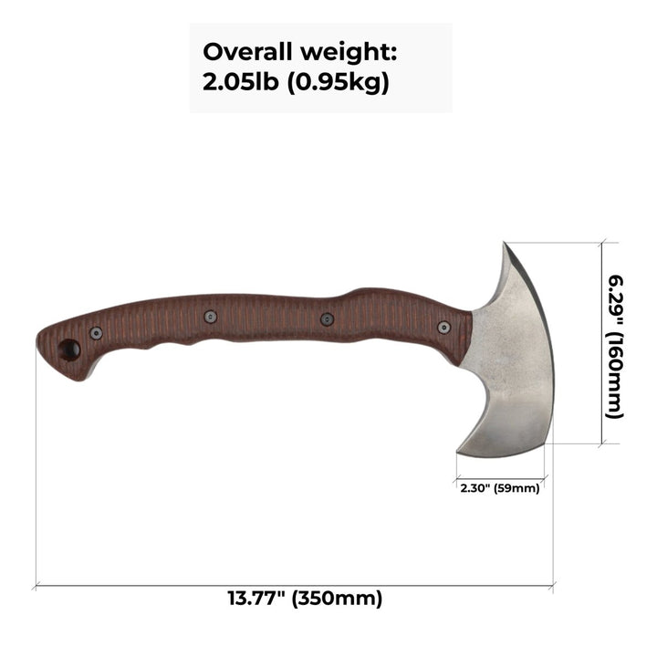 • Specifications: Measuring at an overall length of 13.77", and weighing 2.05lb, its head extends 6.29" with a blade length of 2.36". Forged from hadrened high carbon steel 4340 with an 8mm thickness, it guarantees longevity.