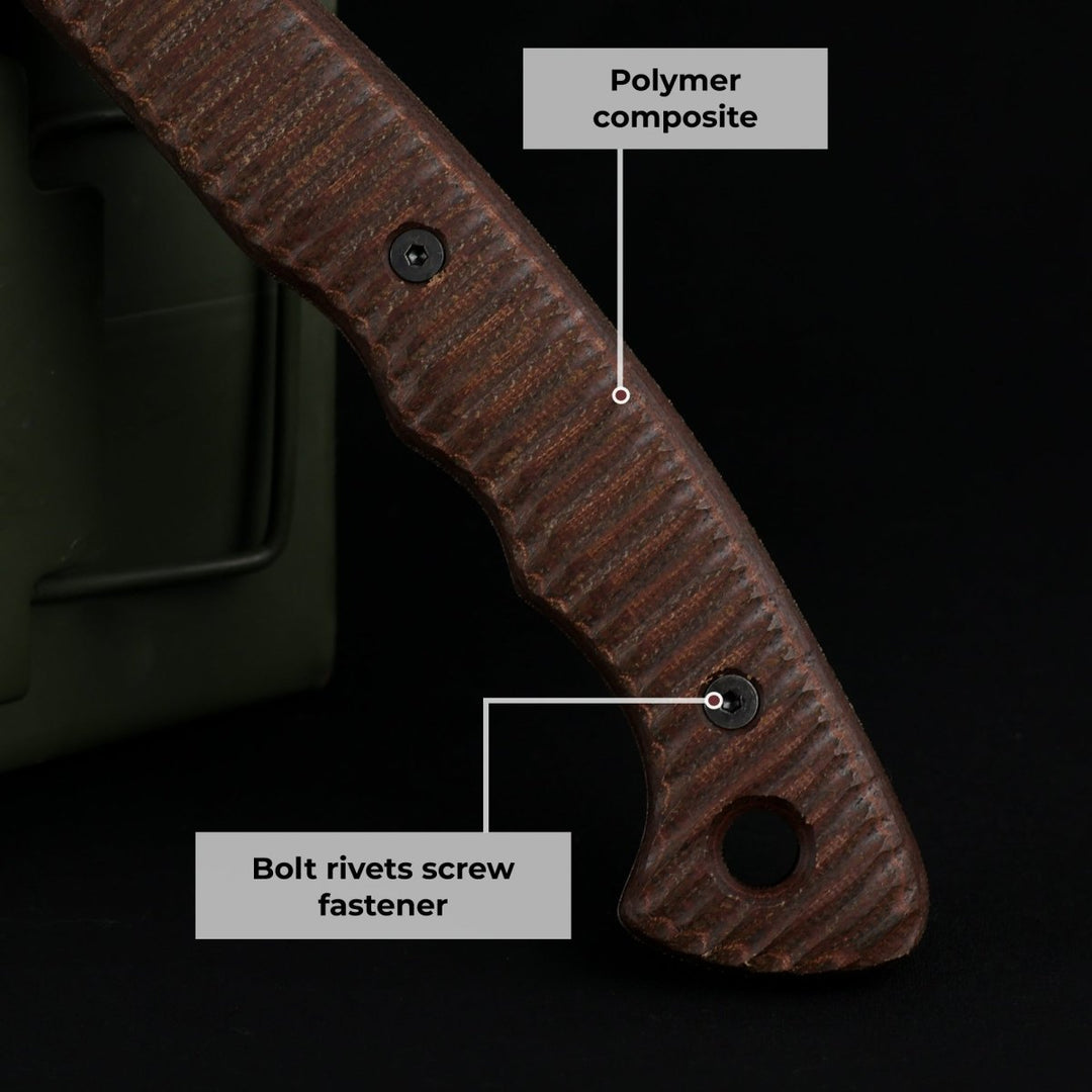 • Polymer Composite handle: Equipped with sturdy polymer composite overlays, similar to Micarta, these are secured with flat hex bolts and are replaceable. The material's pleasant texture ensures a non-slip grip and reliable handling in various conditions.