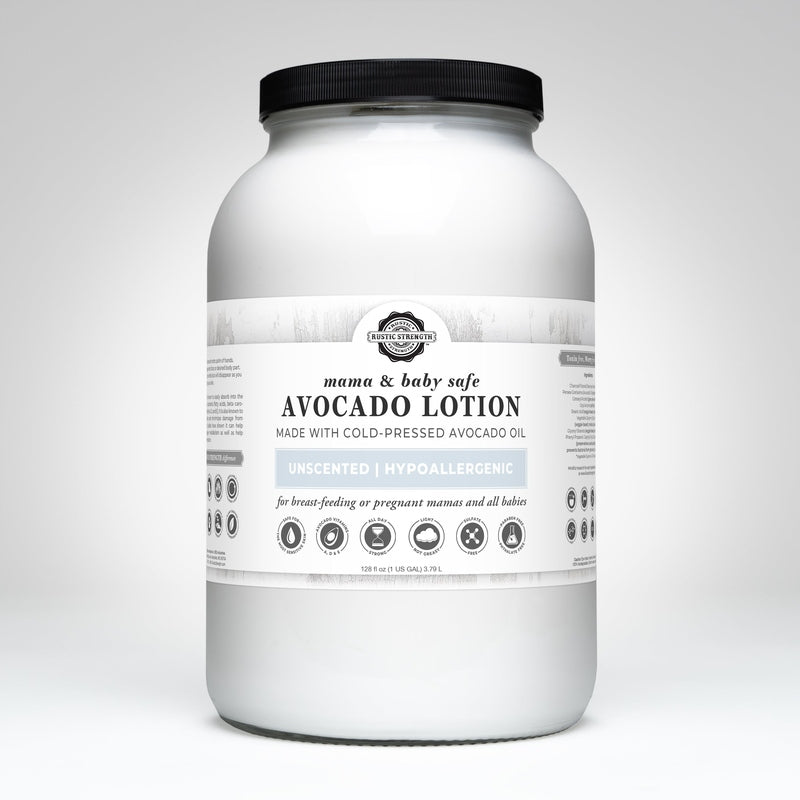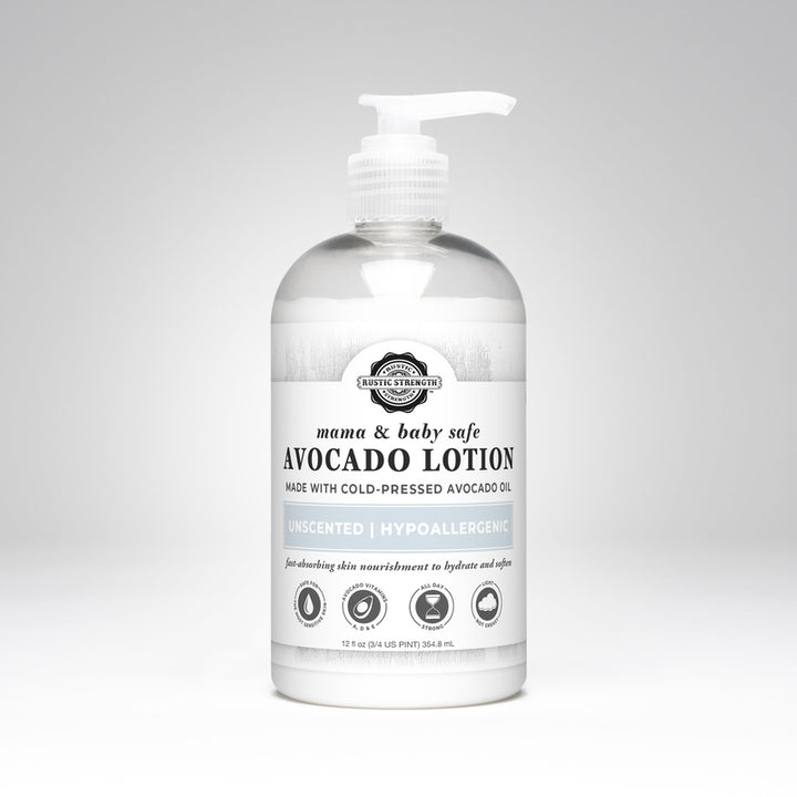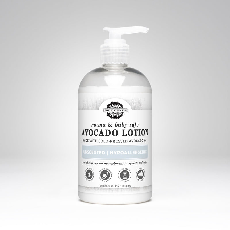 Mama + Baby Safe | Rustic Strength Avocado Lotion is made with high-purity and concentrated active plant-based ingredients and is less likely to irritate even the most sensitive skin. It is safe for pregnant or breastfeeding mamas as well as babies, when no scents are added. That's why we called this unscented line "Mama + Baby Safe"