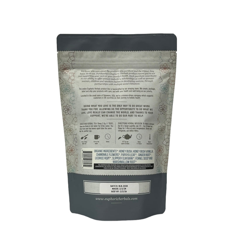 Organic Ingredients*: Honeybush Vanilla, Chamomile Flowers*, Slippery Elm Bark*, Papaya Leaf*, Marshmallow Root*, Fennel Seed*, Licorice Root*, and Ginger Root*.
