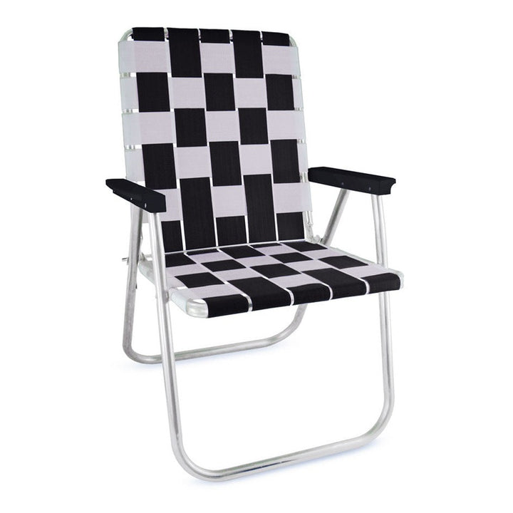 Add classic style to any room with the Black & White Classic Chair with Black Arms! Featuring a distinctive checkerboard pattern, this chair has a light weight aluminum frame and is made in the USA. Enjoy timeless design and superior craftsmanship - get yours today!