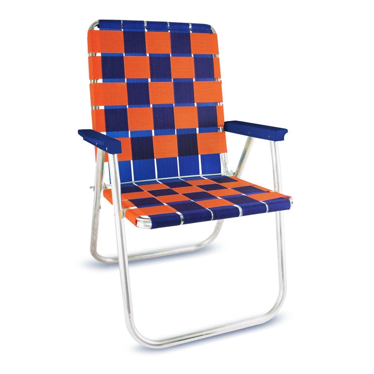 Experience the easy luxury of the Blue & Orange Classic Chair. Crafted in the USA with a sturdy aluminum frame and vibrant blue and orange pattern, this chair will bring comfort and style to any room. Enjoy the ergonomic arm rests for an even more comfortable experience.