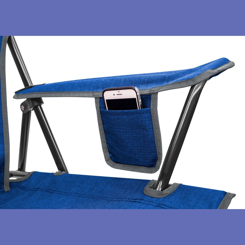 One-step set up, No locks or assembly needed.“No sag, no bite” seat.Heathered polyester ripstop fabric, with Mesh backrest.Beverage holder, Phone pocket, and Carry bag.Frame supports up to 300 lb (136 kg)