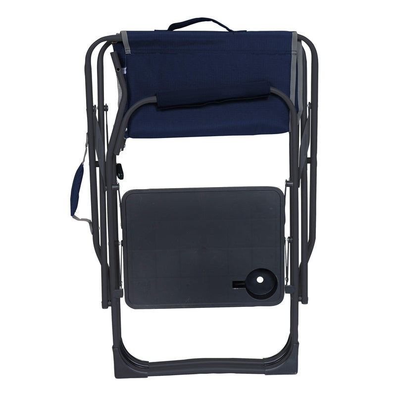 A comfortable folding directors chair in a compact package! Able to fold up 40% smaller than similar styles. Padded armrests and a side table make this seat a tried-and-true favorite.