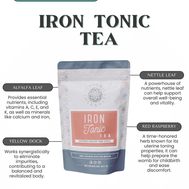 A powerhouse blend carefully crafted to support your overall well-being and boost your vitality. Packed with organic ingredients like Nettle Leaf, Alfalfa Leaf, Yellow Dock Root, Red Raspberry Leaf, and Dandelion Leaf, this tea is designed to replenish your body's iron levels naturally while providing a host of additional health benefits.