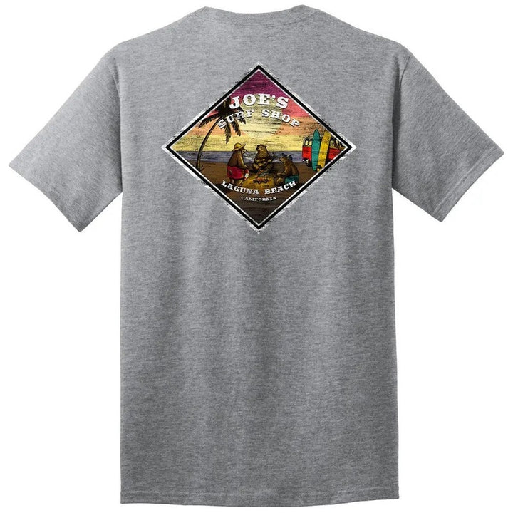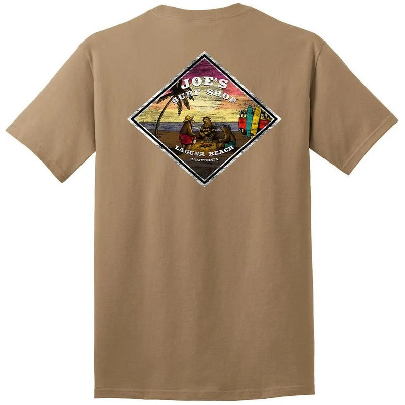 The story behind the Joe's Surf Shop 3 Bears On A Beach Heavyweight Cotton Tee is quite unique. Three bears huddled around a crackling bonfire at sunset. The orange and yellow flames illuminated the sand and reflected off their fur. They took turns sharing stories from when they were cubs while one bear was strumming his guitar.