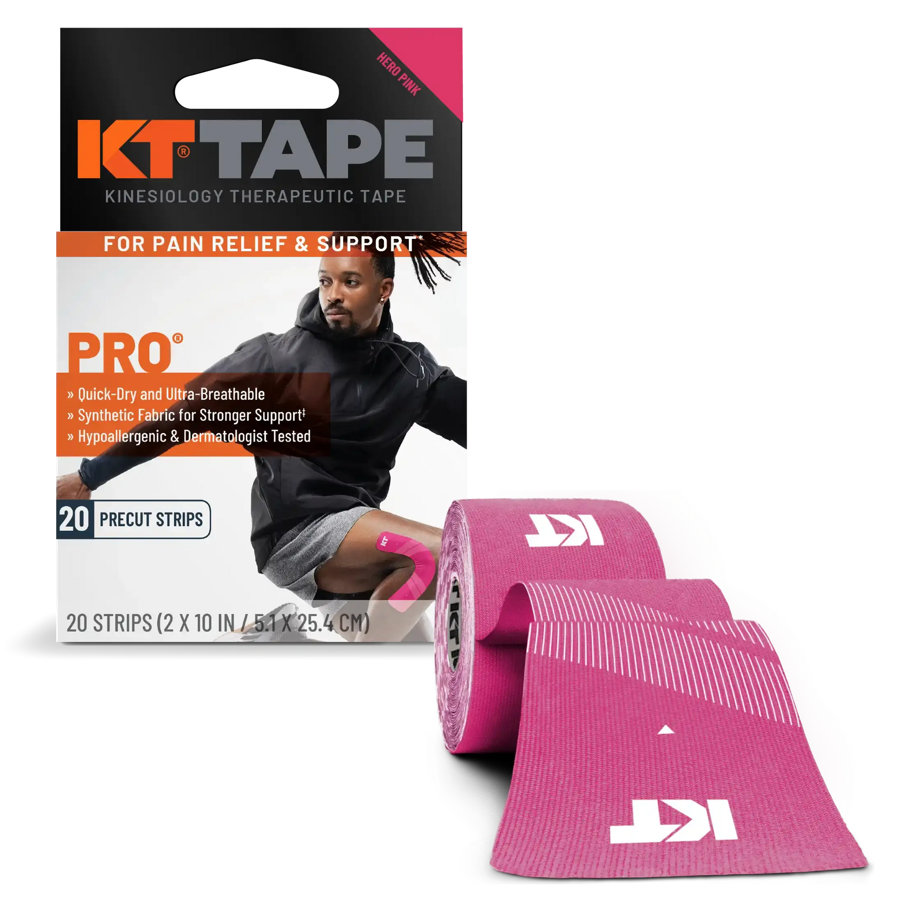 KT Tape Pro® is pre-cut athletic tape and ready to apply right out of the box. Pre-cut strips have rounded corners which help to prevent the corners from catching on clothing or the edges fraying. Each roll contains 20 pre-cut strips that are 10 inches long and 2 inches wide.