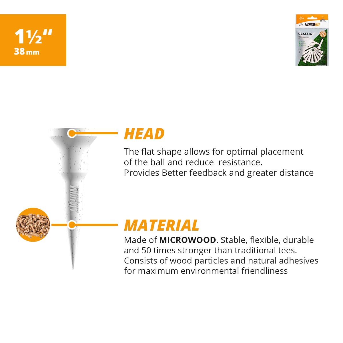 FLEXIBLE, DURABLE & STURDY: Lignum's microwood construction is 50x more durable than traditional tees, offering the benefits of durability and stability so that golfers can keep using them for a long time. Lignum's construction uses the right amount of polymer fiber for flexibility that increases speed of the ball significantly compared to traditional wood or plastic tees.