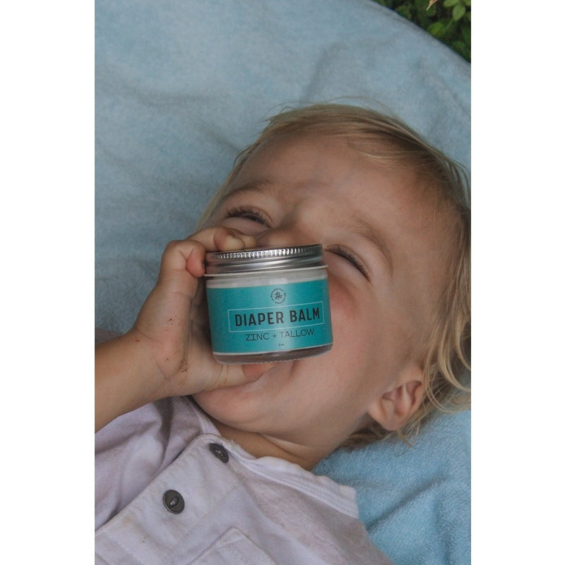 This delicate tallow + zinc-based diaper balm will soothe and heal diaper rash while protecting healthy skin. Our vitamin-rich creamy balm is safe enough to use with every diaper change. Free from essential oils. Cloth diaper safe.