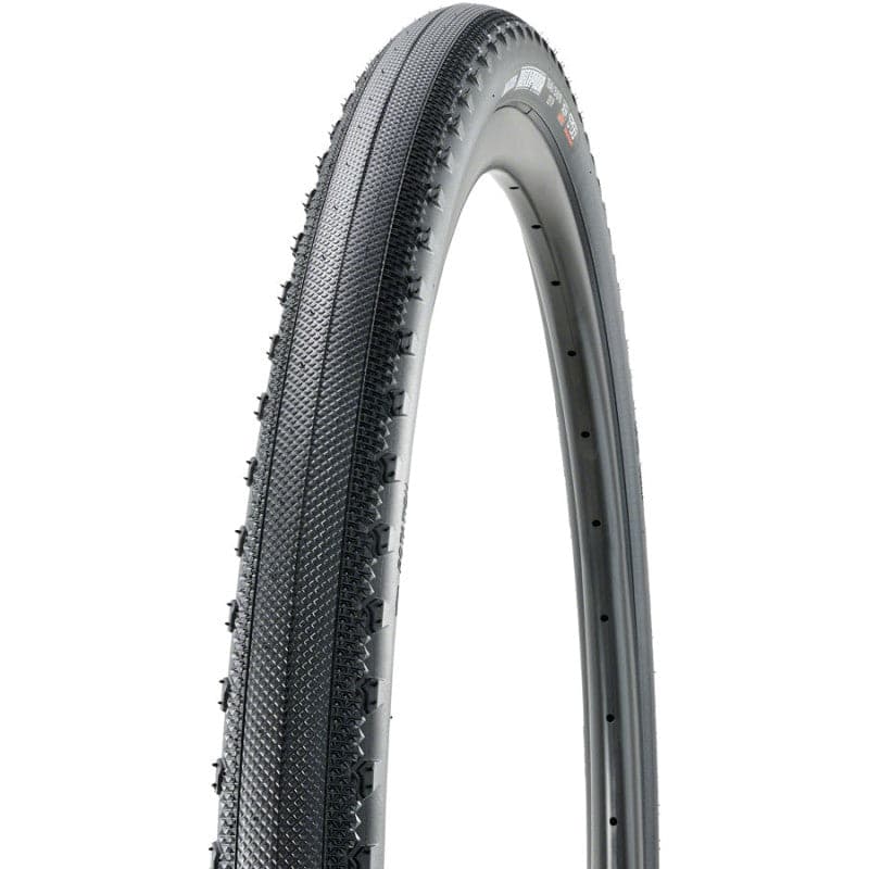 Semi-slick tire for pavement, hard-packed dirt, and gravel.