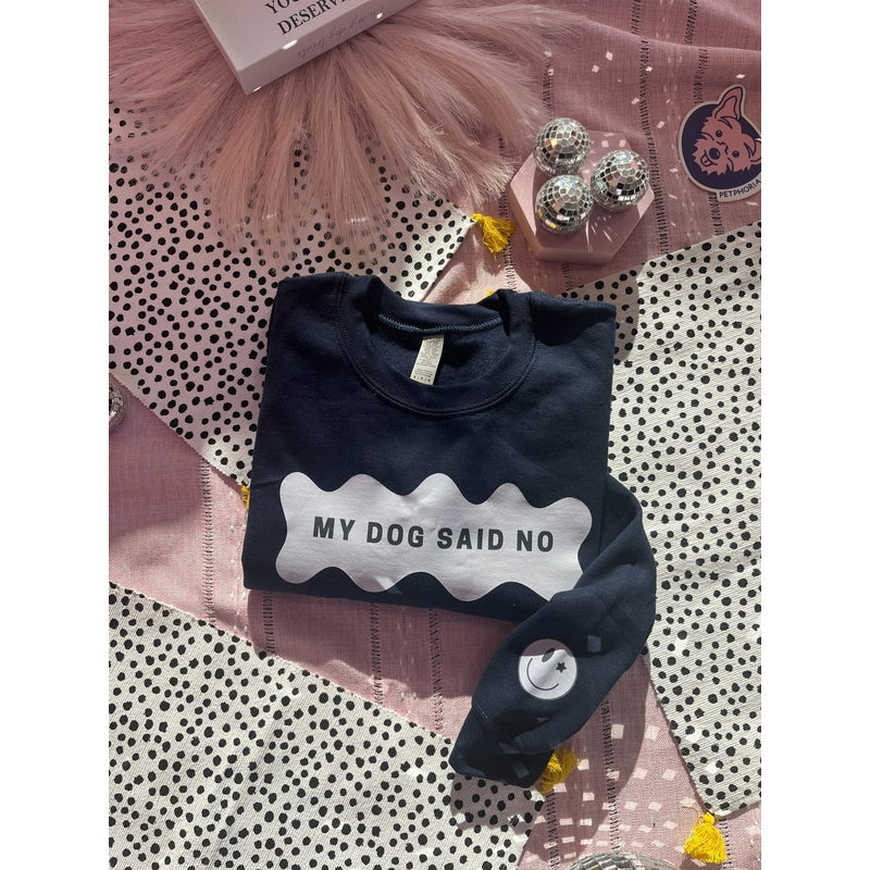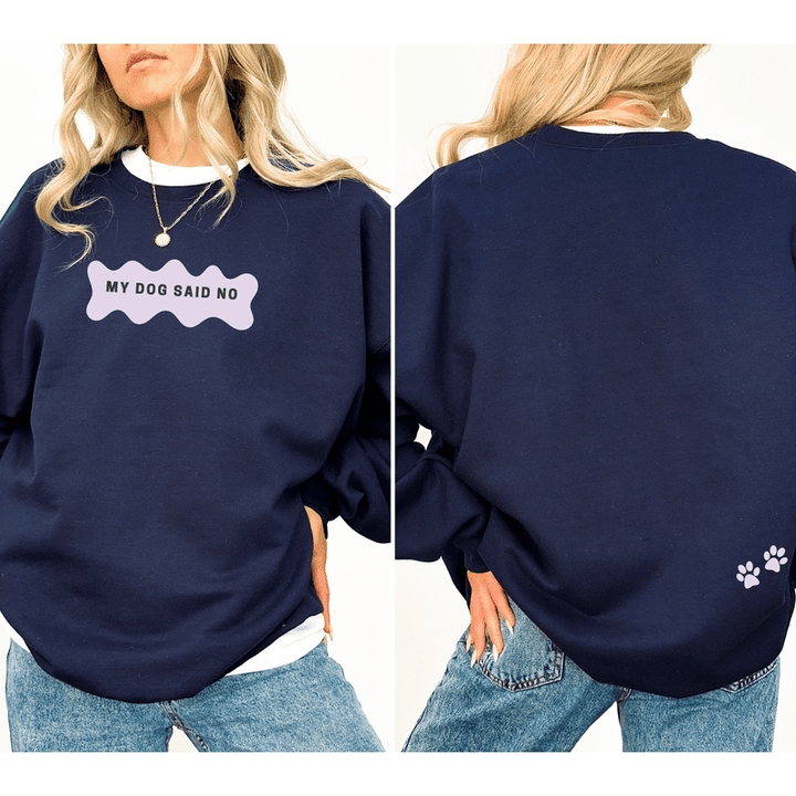 My Dog Said No Crewneck – a uniquely designed, hand-printed garment that's perfect for dog lovers with a sense of humor. Crafted with care in Madison, WI, this crewneck features the witty message "My Dog Said No" on the front, adorable purple paw prints on the back, and a cheeky smiley face on the sleeve to add a touch of fun and personality.
