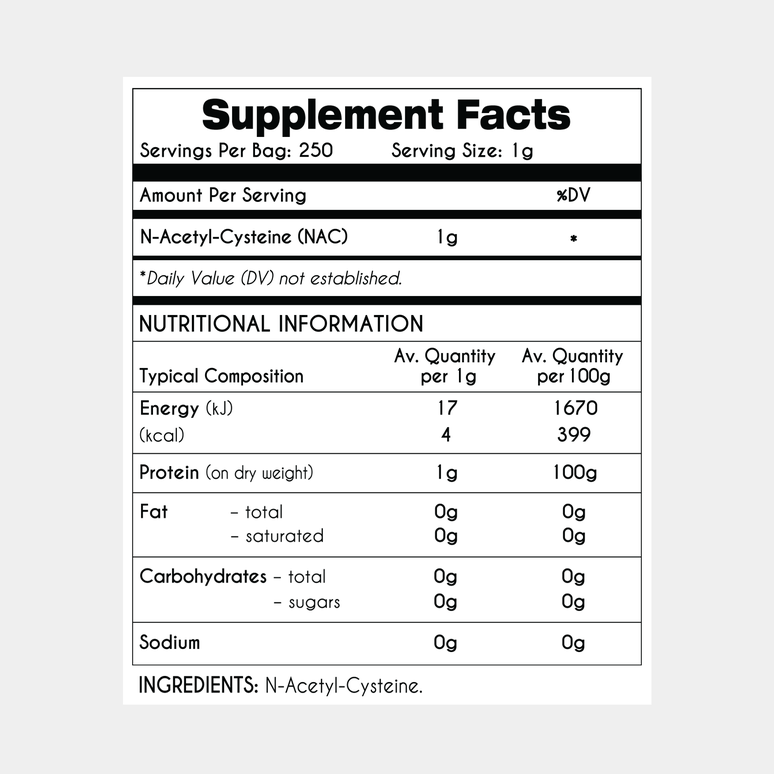 Pure, pharmaceutical-grade N-Acetyl-Cysteine (NAC) powder. Our NAC powder supports antioxidant production, detoxification, and immune function. This unflavoured, vegan-friendly supplement aids glutathione production, promoting liver, brain, and respiratory health. Third-party lab-tested for purity and quality, our NAC is also a carbon-neutral product.