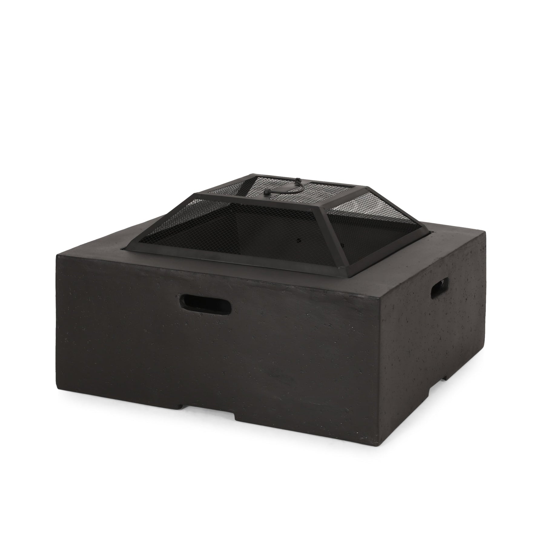 This wood-burning fire pit features a square design crafted from lightweight magnesium oxide concrete, ideal for outdoor living spaces such as patios or backyards. It combines functional warmth with a modern aesthetic to create a welcoming gathering spot.