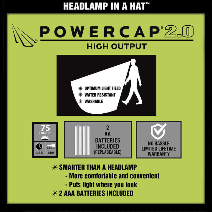 For the technology included in these Official Ike hats, they all include our LED system that can produce up to 75 lumens of powerful light. POWERCAP beanies includes 2 AAA batteries — that you can replace and also replace with rechargeable AAA batteries.