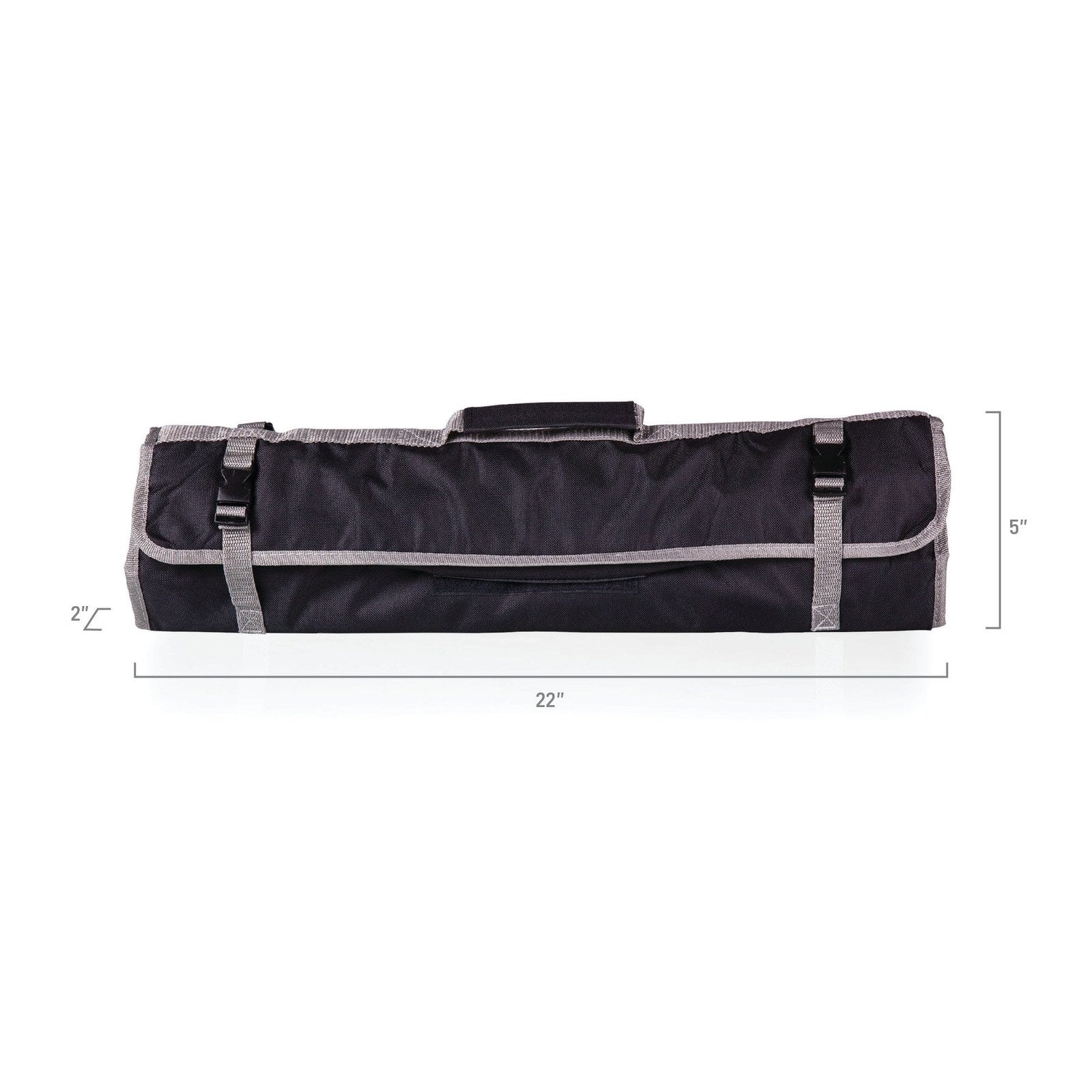 The Picnic Time 3-Piece BBQ Tote is a sleek and stylish barbecue set in a roll-up polyester bag with an adjustable shoulder strap. This highly portable bag securely holds all the stainless steel grilling tools you need for the job: one large spatula with an integrated bottle opener, one bbq fork, and tongs. The perfect gift for the grill master in your life, the tools have extra-long, beautiful wooden handles to keep your hands away from the flames, and metal loops at the ends to hang on the bbq. Fire it up!