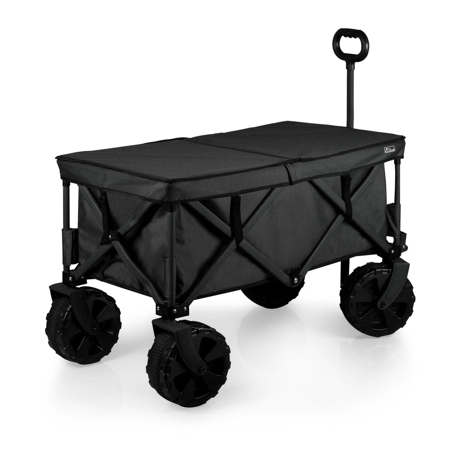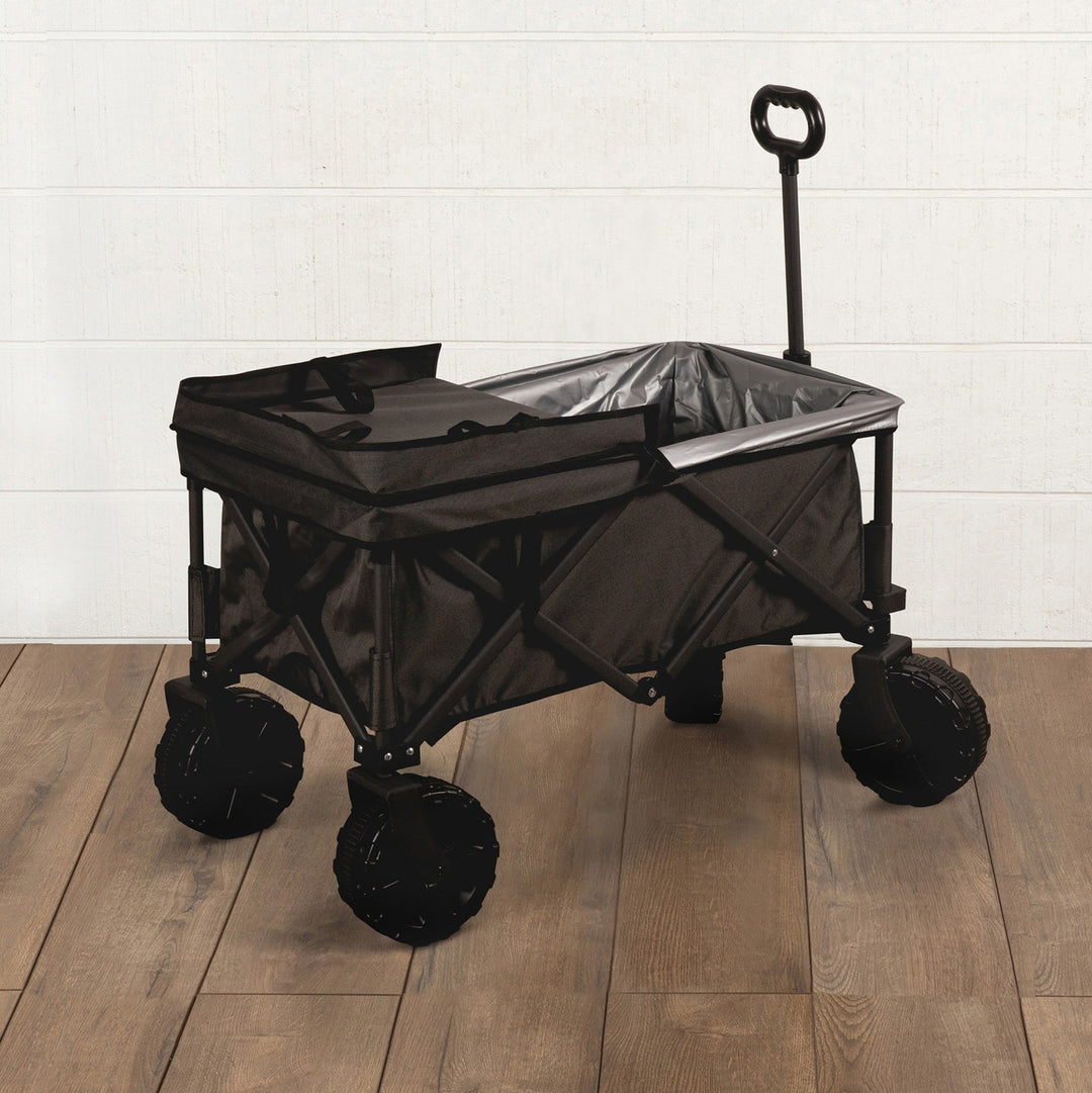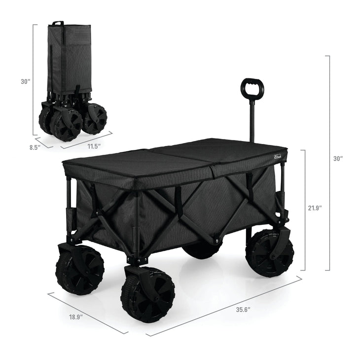 Save your back on and off road with the Adventure Wagon Elite All-Terrain Folding Beach Wagon with Big Wheels plus Table Top Lid & Soft Cooler Liner, a sturdy utility wagon with endless uses, thoughtful accessories, and a rugged 225 weight capacity. With a powder-coated steel frame and durable two-tone polyester canvas for hauling everything you need, this all terrain luxury trolley can take you everywhere from beach picnics to camping to shopping for groceries at your local farmer’s market. The ultra big wheels make this garden wagon ideal for hikes, camping and any off road picnic adventures. This folding wagon packs away compactly, sets up easily, and has a telescoping handle for ease of use. A zippered, hanging storage pocket inside the beach wagon cart is perfect for your phone and other delicate items. But wait - that’s not all! The food-safe PVC soft cooler liner features a drainage spout for melting ice so you can convert your outdoor folding wagon to a rolling cooler. Also included is a sturdy polyester-covered table top lid for tailgates and picnics anywhere. Is there anywhere this sport utility wagon can’t go?! Honestly...no!