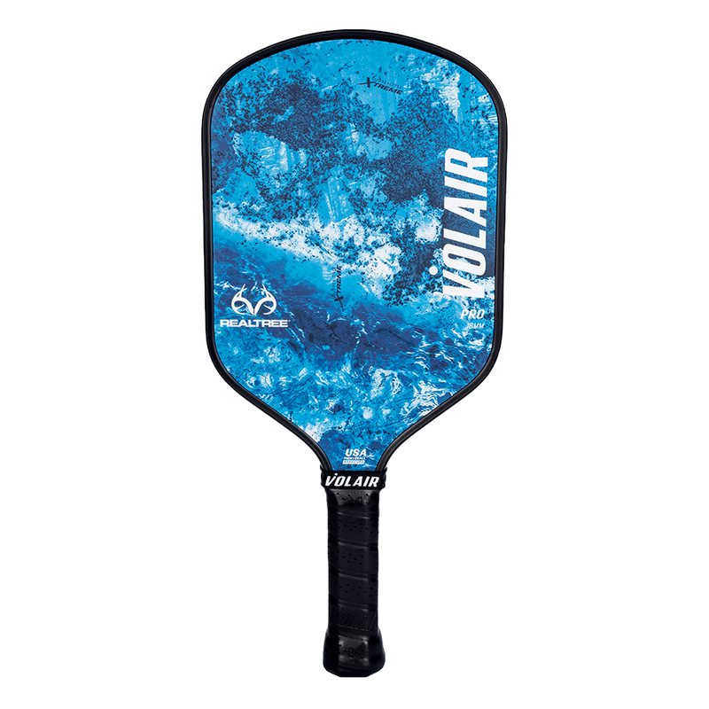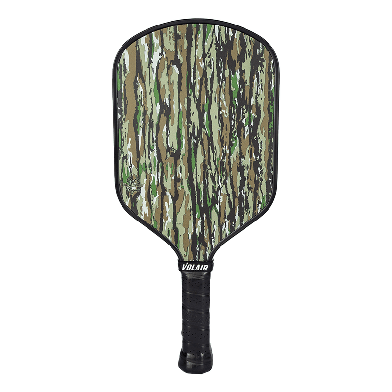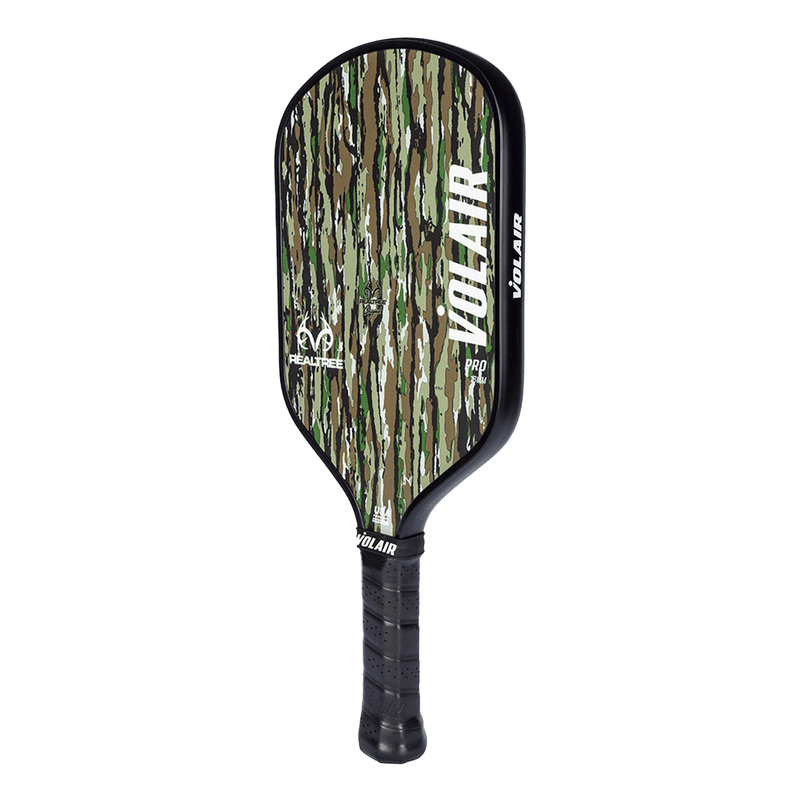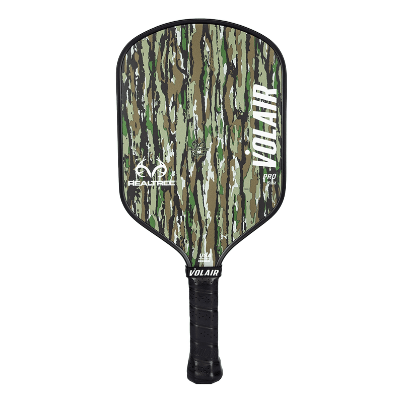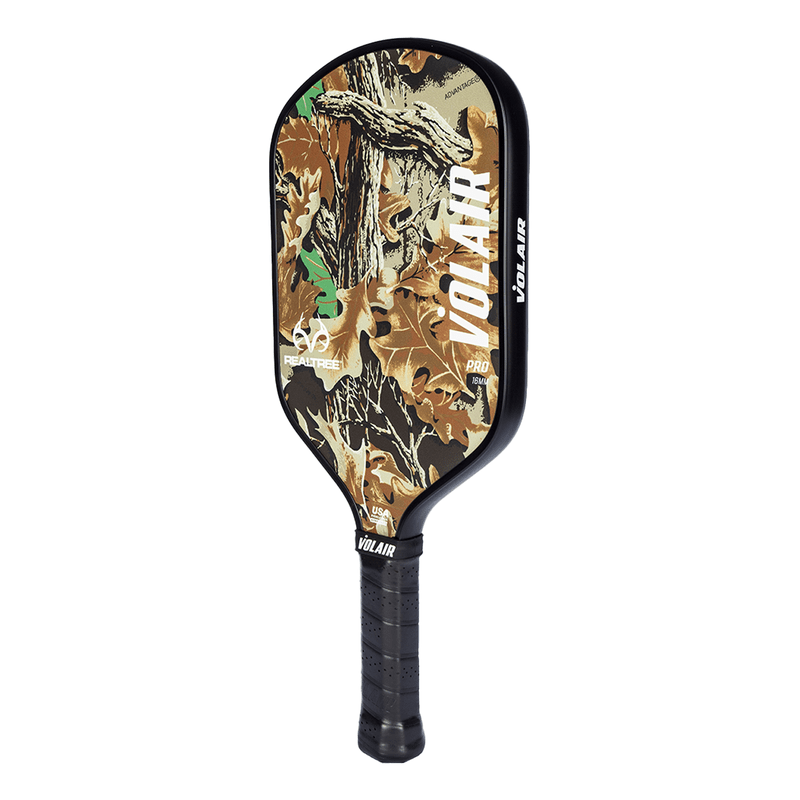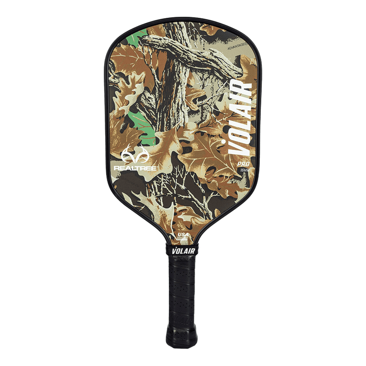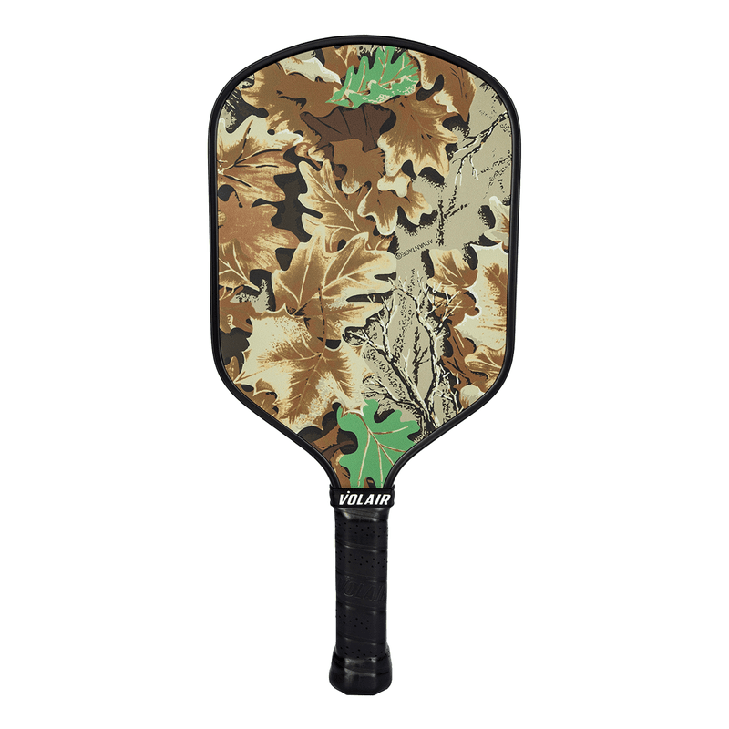 These RealTree x Volair custom pickleball paddles are in our hybrid shape with an elongated handle. USAPA-approved with fiberglass face.