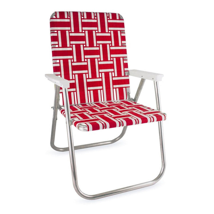 This vibrant aluminum folding chair screams American Classic. Its bright red webbing adds a pop of color to every beach bash and summer get-together. While as eye-catching as Waldo's striped shirt, this customer-favorite aluminum folding chair is even more practical than it is attractive. Durable and high quality, this fold out lawn chair is made using a rust-free, lightweight frame and durable UV-resistant webbing on the seat and back. It's a comfortable lounge chair and easy to tote around and store.