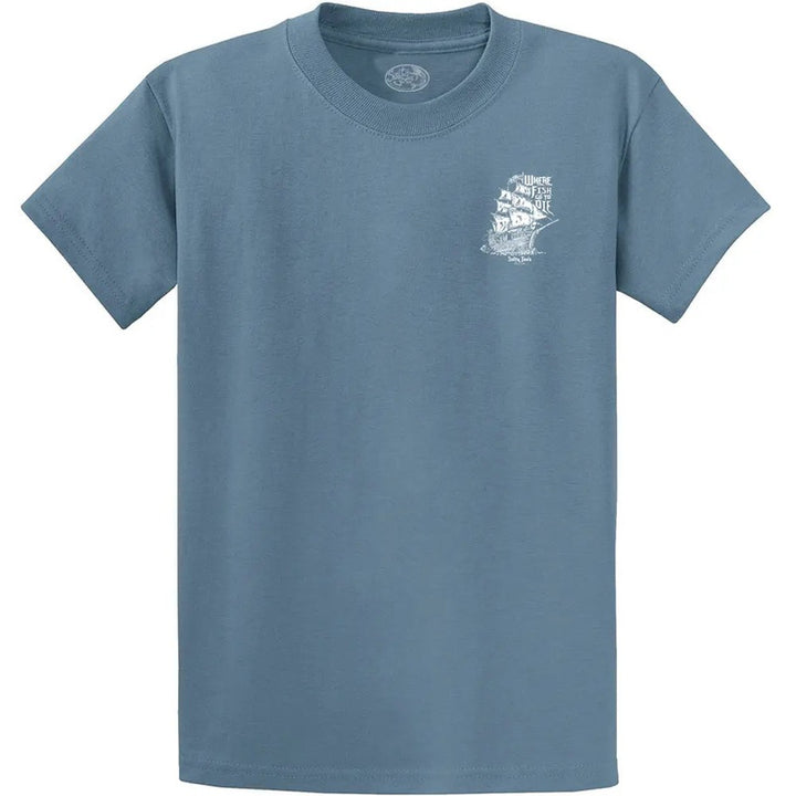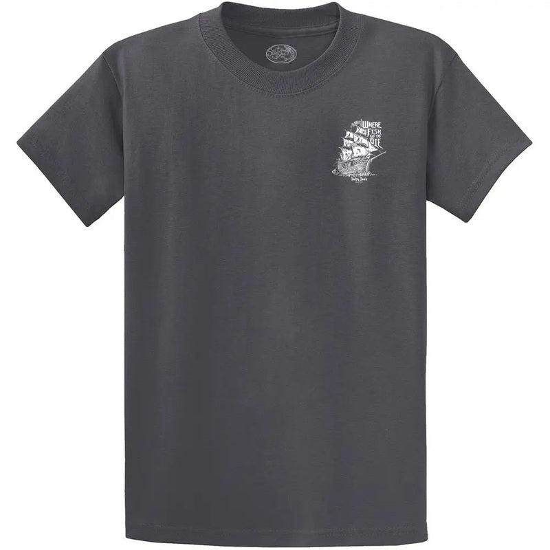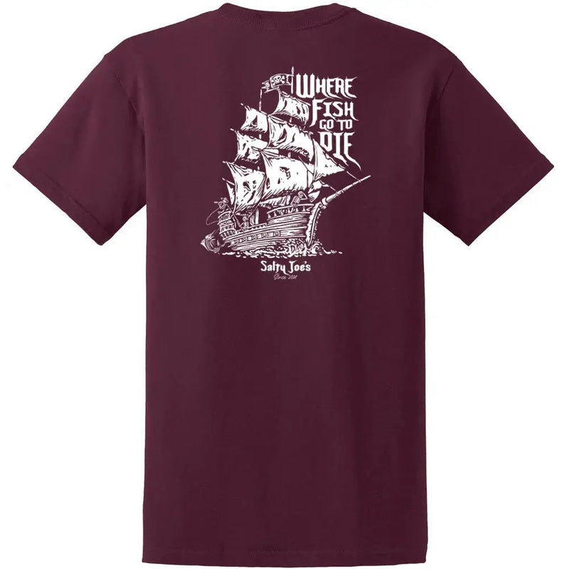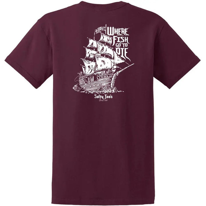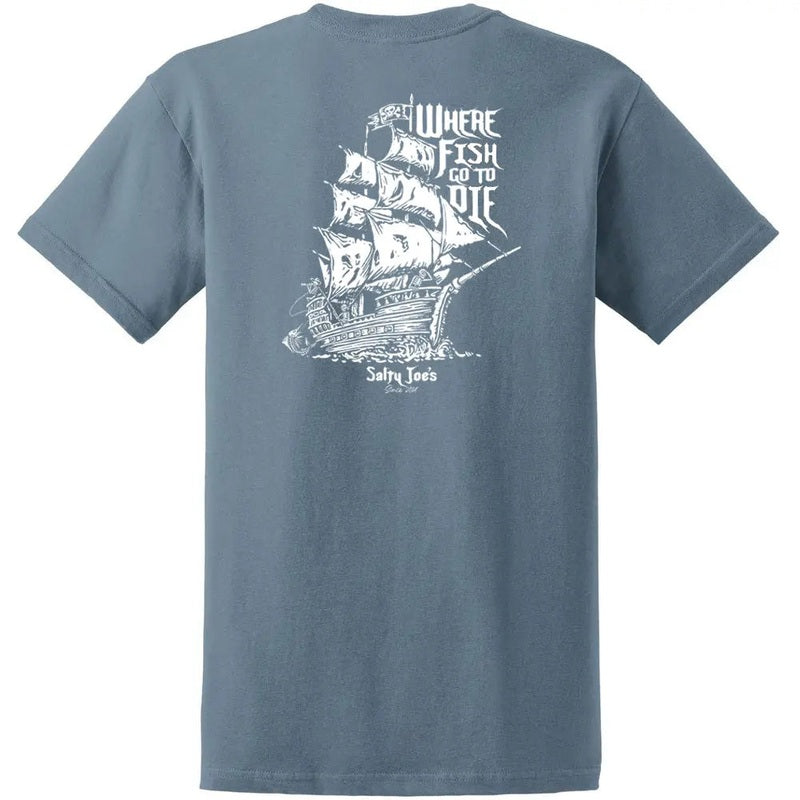 A deeply detailed logo that illustrates pirate life. This tee was meant for those looking for a mix of pirate and skeleton. Displayed on this tee is a pirate skeleton driving a pirate ship. This skeleton ship features skeletons fishing for dead fish. Doesn't get more edgy than that! Grab your Salty Joe's Back From the Depths Heavyweight Cotton Tee today with free shipping on orders 65$+.