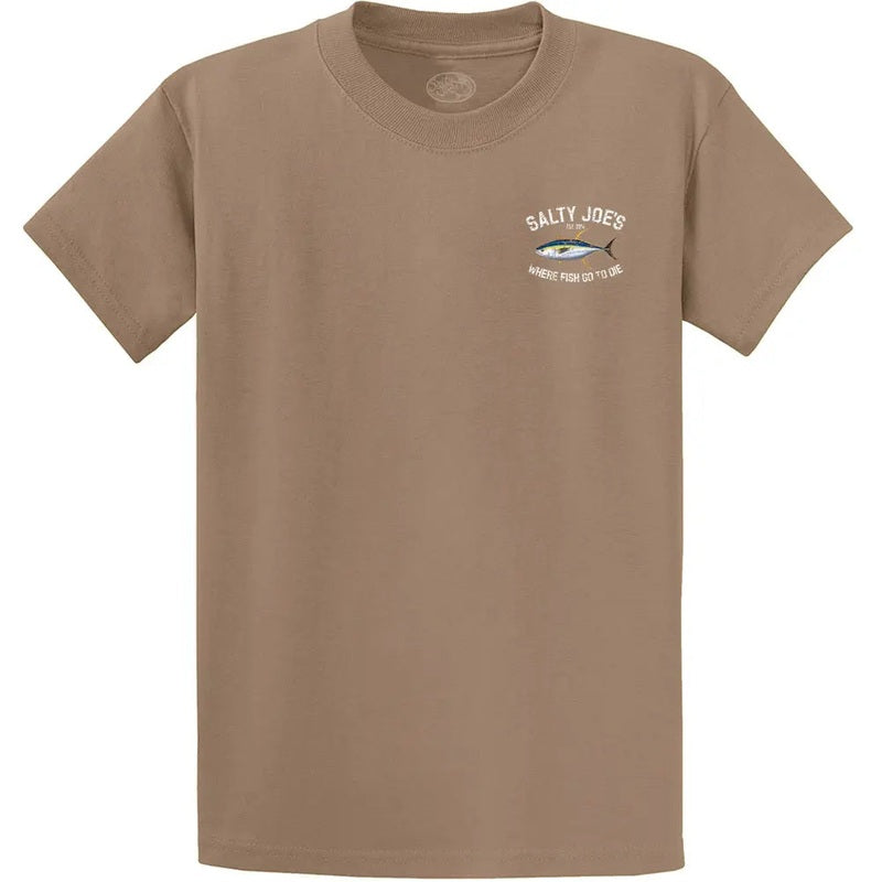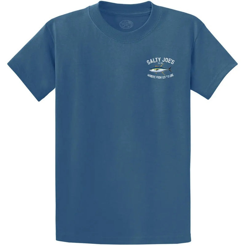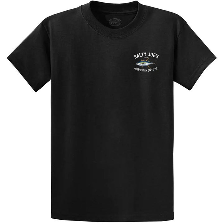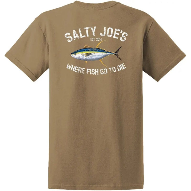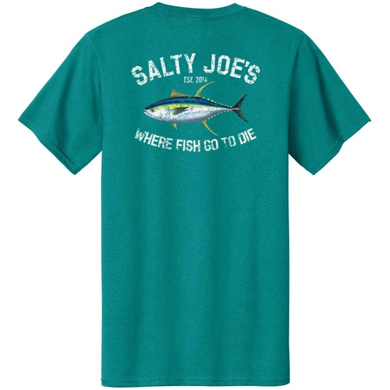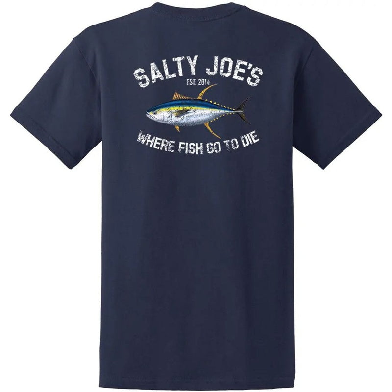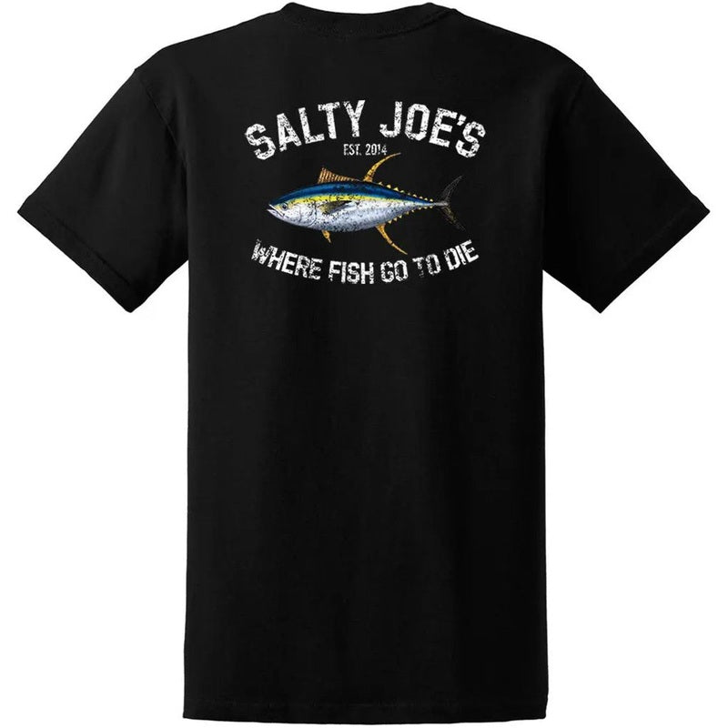 The Salty Joe's Tuna Shirt is the perfect addition to your wardrobe if you are looking to purchase fishing t shirts. This logo details a Yellowfin Tuna, one of the most sought after fish in the sea. If you are a fisherman, you know what a Yellowfin Tuna is. Below this clean logo, the Salty Joe's motto "Where Fish Go To Die" is displayed. Get yours today.