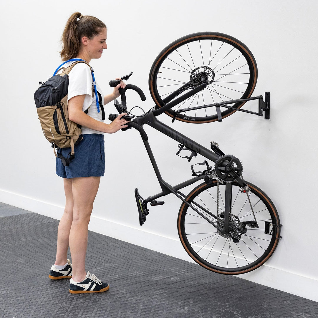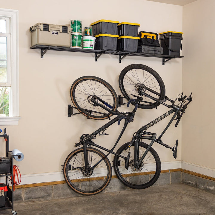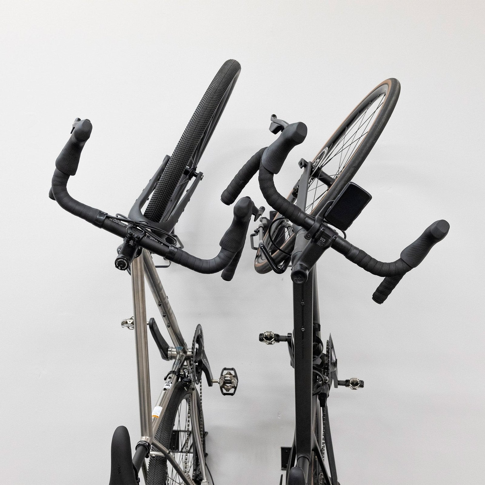 No-lift swivel mount bike storage rack for two road and gravel bikes