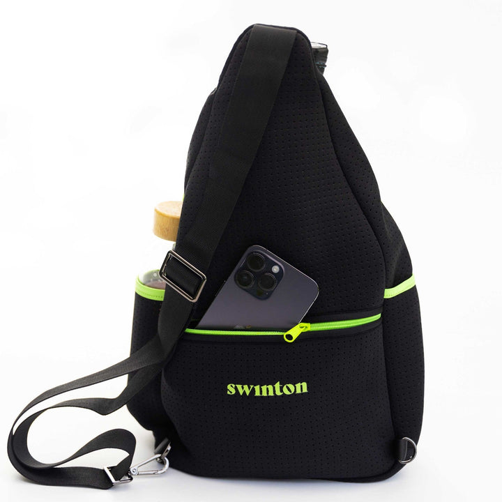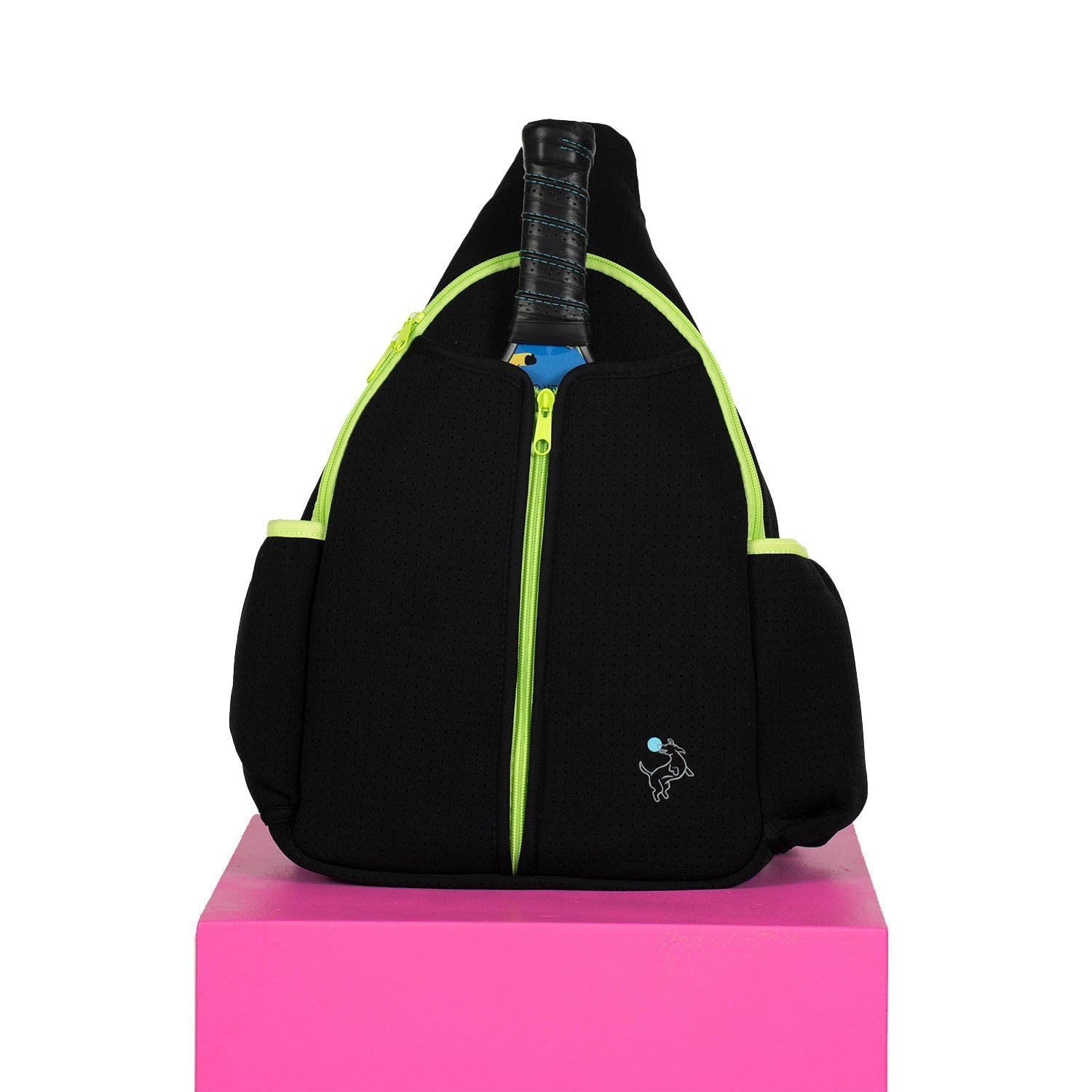 Meet the ultimate pickleball bag. This one shoulder sling bag is designed to be carried by men and women, perfect for any pickle baller. Zip one or two pickleball paddles into the outer pocket for easy access and pop your water bottles into the outer water bottle holders. The bag is just the right size to carry balls, a towel, water, an extra shirt, or whatever else you may need as you head off to the pickleball court. Plus, the bonus back pocket is the perfect place to stash your cell phone, keys and wallet. There is also an extra interior pocket for small items.