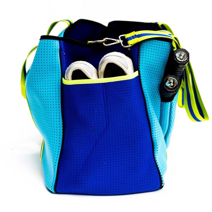 You asked and we delivered. This XL pickleball duffel bag is your new favorite carry all and sure to be the envy of the court. It holds ... well, everything. Two paddles zip into the front, it has an extra large reinforced interior pocket, small stash pockets on the inside, as well as side pockets that are great for shoes, water bottles, etc. It includes a longer optional strap. Made of neoprene, this bag is durable. Available in blue and black.