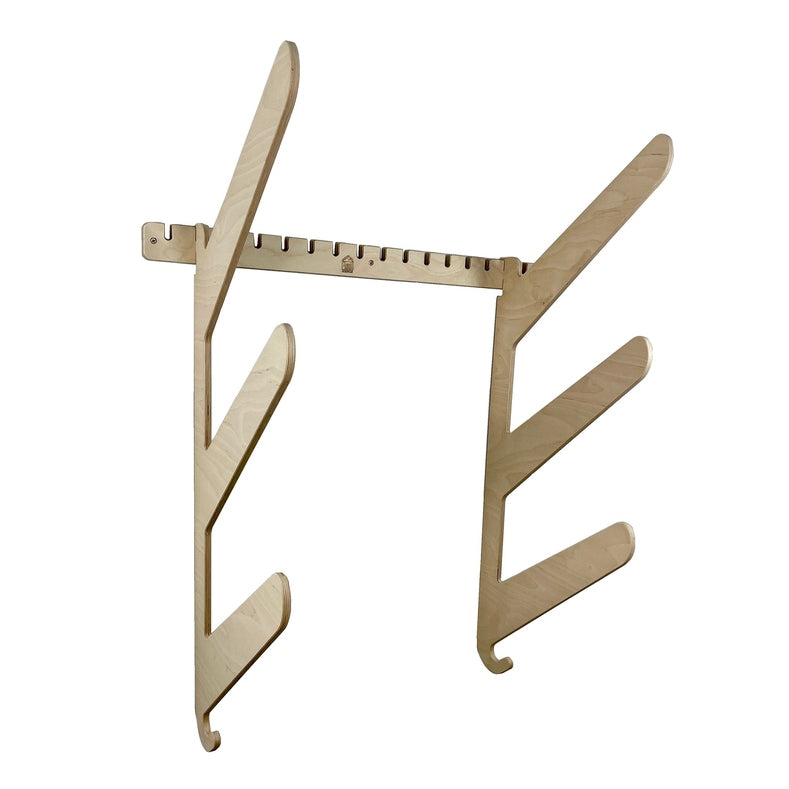 The Exhibitor wall rack has a really cool feature – its unique wall mounting system. Each rack arm is actually “hooked” into a cross support bar and allows it to independently move around. What this means for you is that mounting the rack is super easy and forgiving. For instance, say you mounted a surfboard rack permanently on the wall, then went to put your boards in place but then found that you mounted the arms too close together. With a normal rack, you would have to undo all the work you did and live with the old holes in your wall. With this rack's mounting system, you can simply move the arms apart to your desired distance!