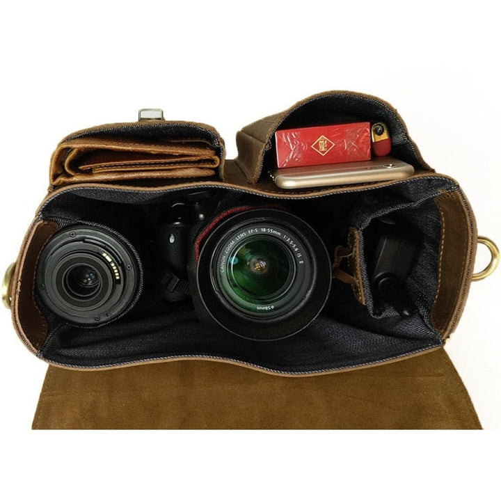The Faust Leather Camera Bag is a handcrafted small leather camera bag made with full grain leather. The Faust Leather Camera Bag is a fully functional, high-capacity leather camera bag for mirrorless and DSLR cameras. The leather is carefully tanned, and the bag is made by hand using traditional techniques. This camera bag is made of thick, full-grain, vegetable-tanned leather. Handcrafted with meticulous stitching and vintage leather, this bag will last you a lifetime. The Faust uses full-grain leather that may have blemishes and characteristic marks. These marks are a natural part of the leather-making process and add to the bag's character. It's really like no other camera bag you've ever seen before, and the design is so simple and so practical that it can also be used as a day-to-day bag.
