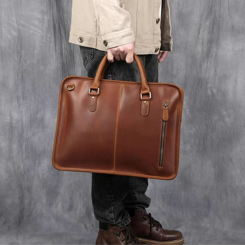The Hemming Leather Laptop Bag is designed to efficiently carry items while amplifying your formal look in a corporate environment. This carry companion is an ultimate all-rounder, allowing for belongings to be carried easily and securely, with its sleek arrangement of spacious interior compartments. The briefcase is made of high-quality crazy horse leather, which guarantees a dependable, lasting product, and a natural color that develops with the passage of time. Laptops up to 15 inches are securely fastened, and further space is ample, making it a perfect carry companion for all your work-related needs.