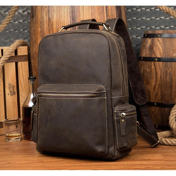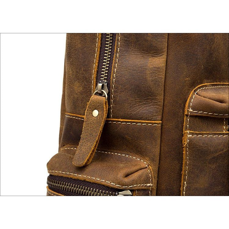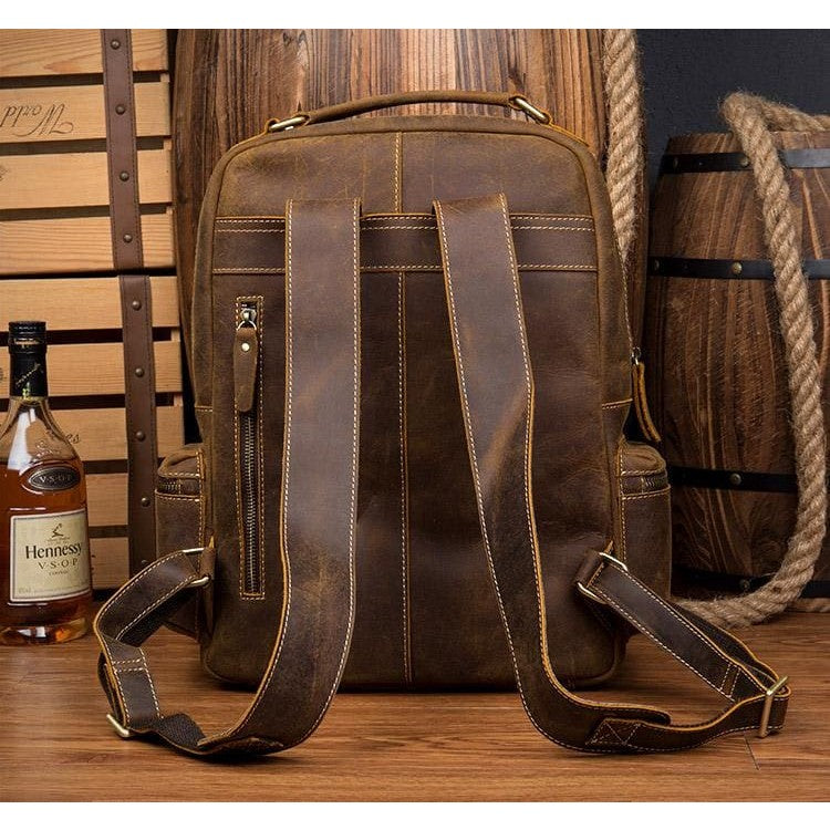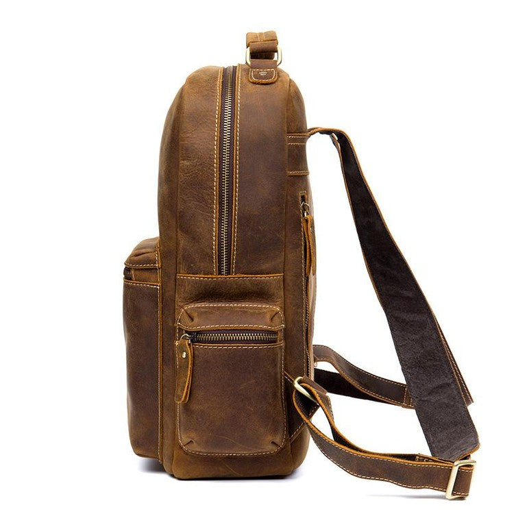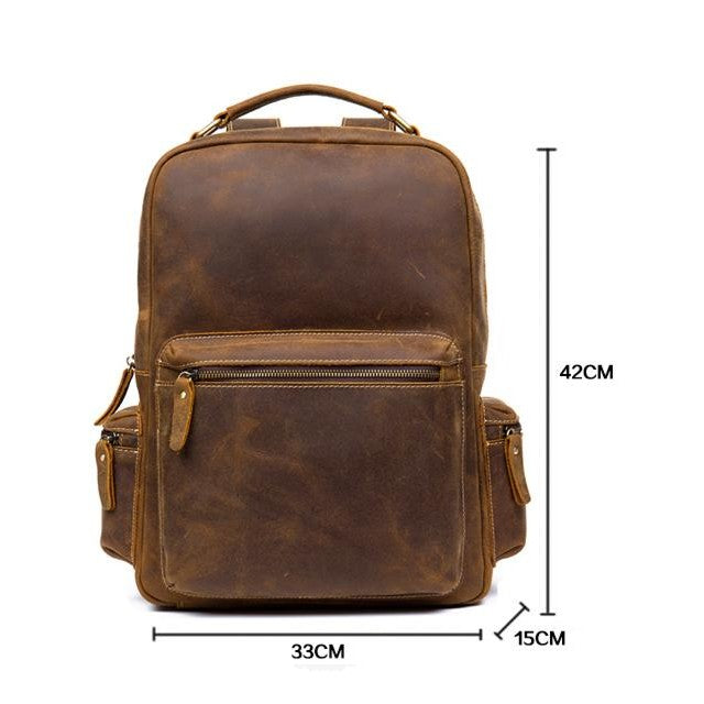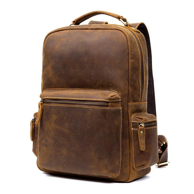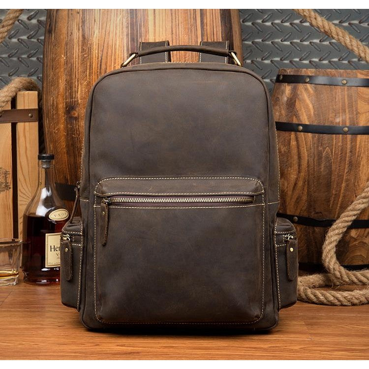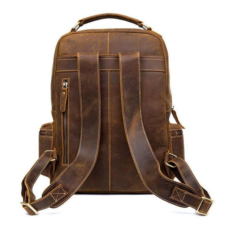 Handcrafted to suit your daily needs, The Langley Backpack is a multifunctional, leather travel backpack made from high-quality crazy horse leather. Functionality and durability are paired with elegance and comfort, as this backpack provides a complete service for school, work or outdoor trips. Featuring one large compartment, three exterior pockets and interior slip pocket, there is ample space for storing all manner of items. The design is made with back support in mind, as it distributes the weight evenly across the body of the bag, providing comfort in transport and security for items. With leather of a rusted deep chocolate brown, the colours will only develop with the general wear and tear of daily use.