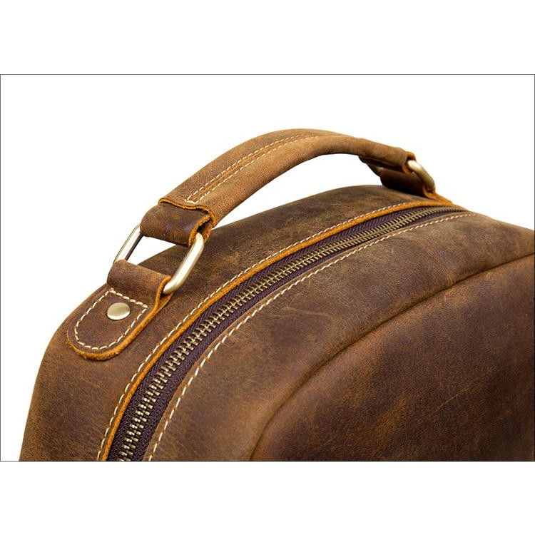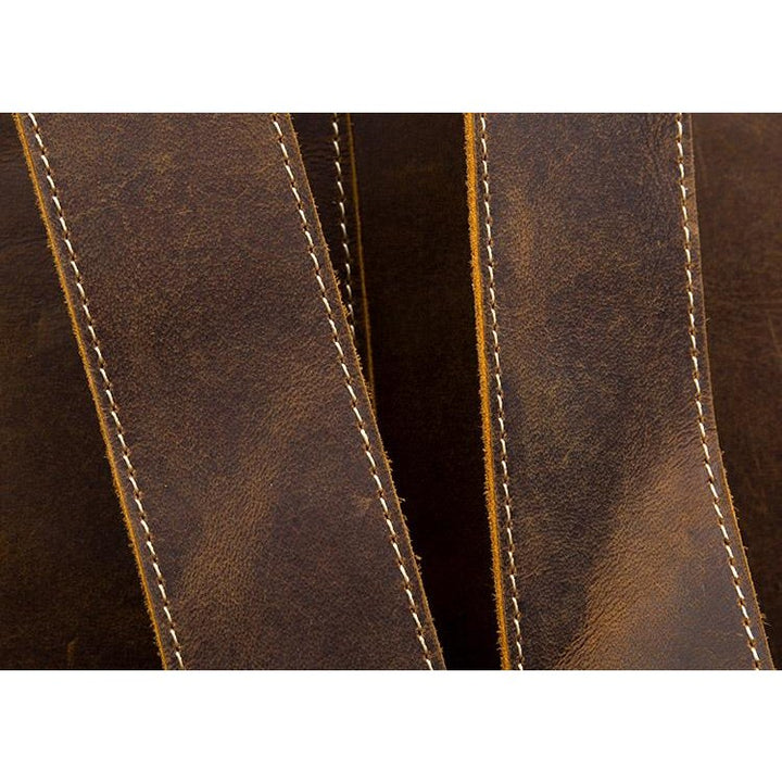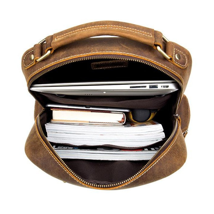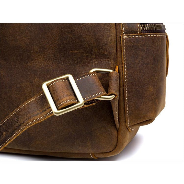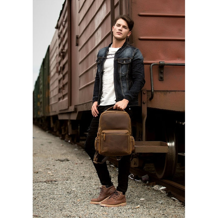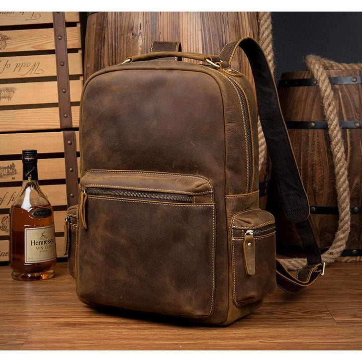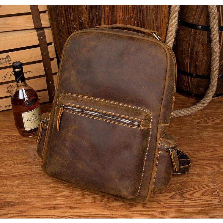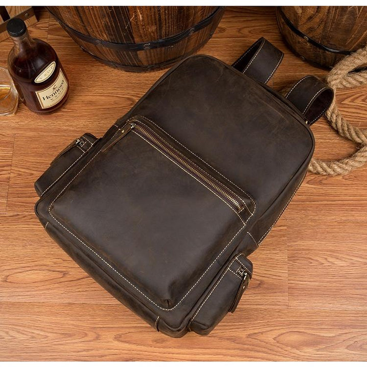 Handcrafted to suit your daily needs, The Langley Backpack is a multifunctional, leather travel backpack made from high-quality crazy horse leather. Functionality and durability are paired with elegance and comfort, as this backpack provides a complete service for school, work or outdoor trips. Featuring one large compartment, three exterior pockets and interior slip pocket, there is ample space for storing all manner of items. The design is made with back support in mind, as it distributes the weight evenly across the body of the bag, providing comfort in transport and security for items. With leather of a rusted deep chocolate brown, the colours will only develop with the general wear and tear of daily use.