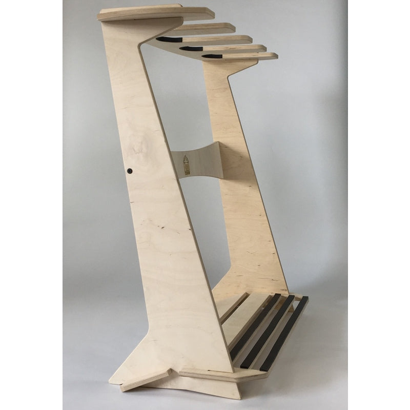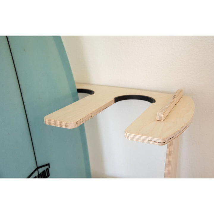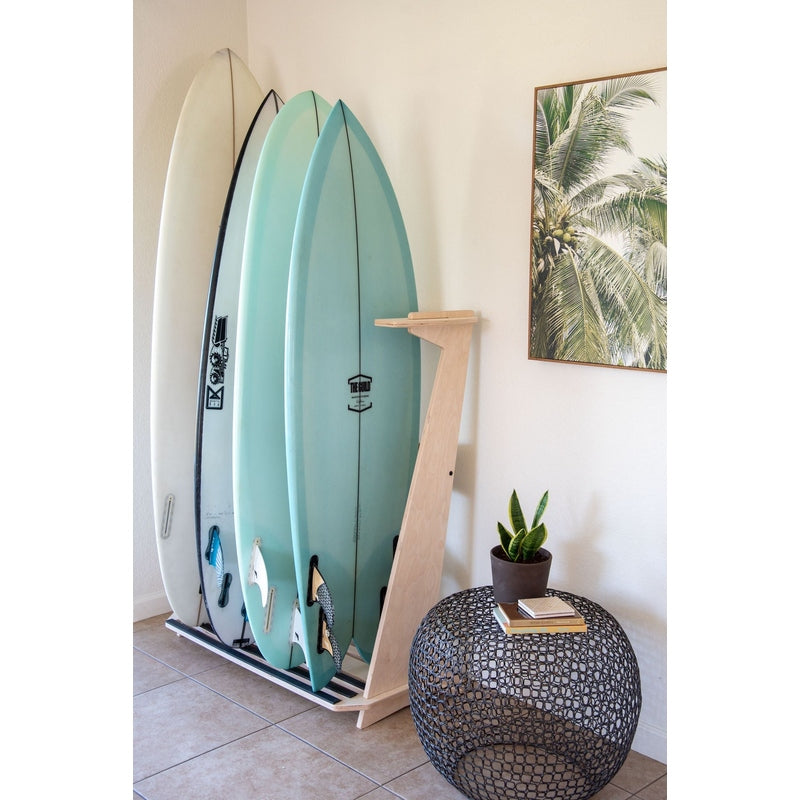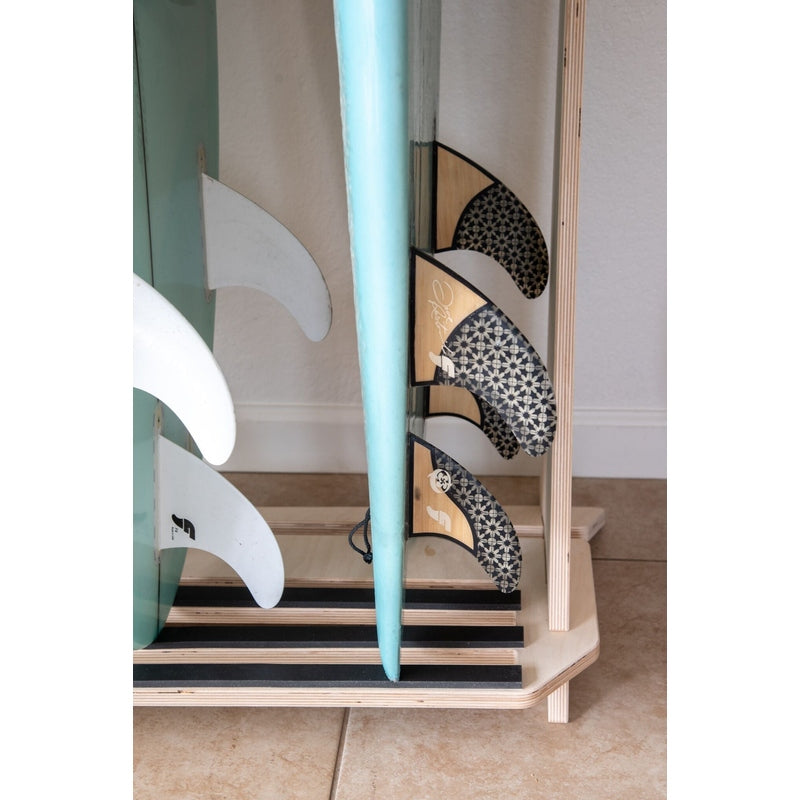 This free standing floor display rack is great for those with a collection of surfboards. Made from beautiful Baltic Birch this rack comes with premium inlaid rubber to protect your rails and thick foam padding to protect your tail.