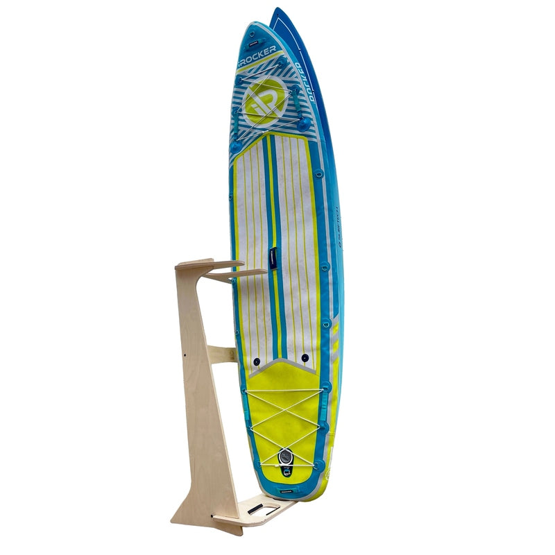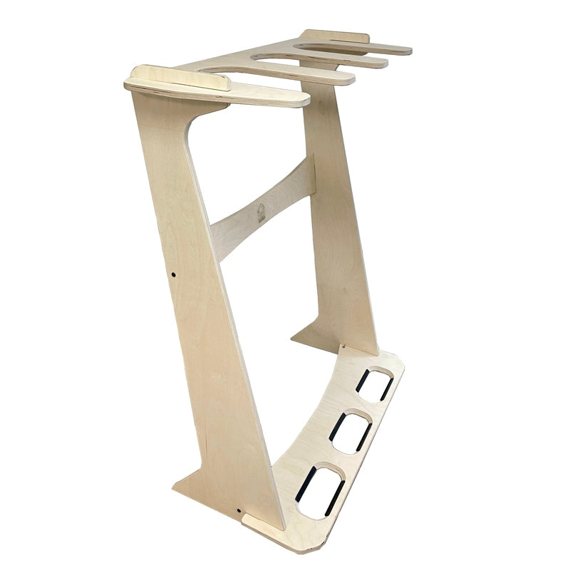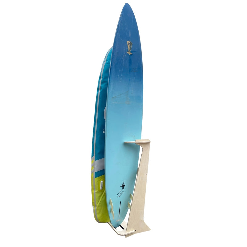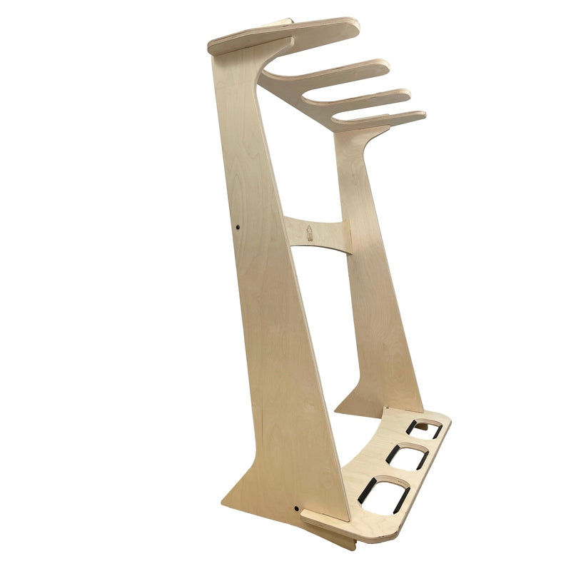 The Pacifica XL free standing floor display rack is meant for wider and longer boards like paddle boards and SUPs. Made from beautiful Baltic Birch this rack comes with premium rubber to protect your tail and has slots wide enough to hold a board up to 7.5" thick.