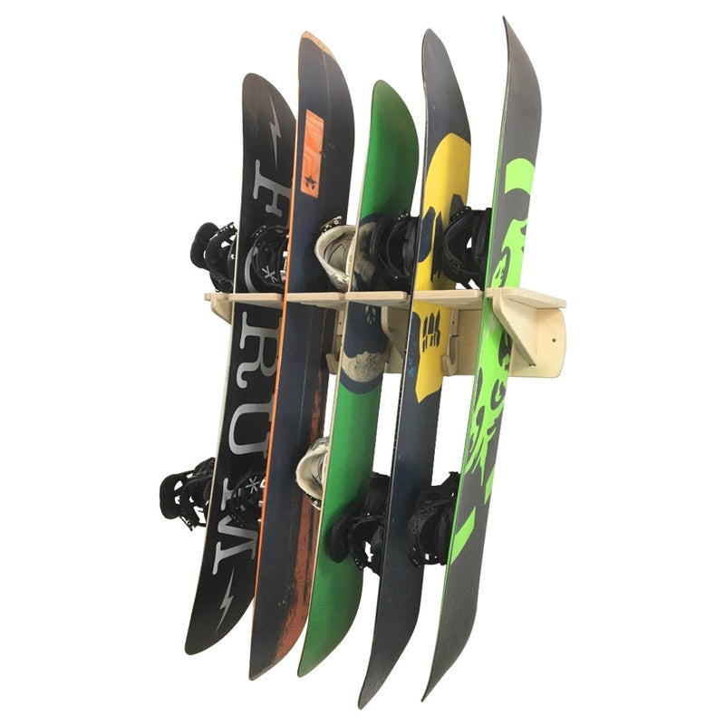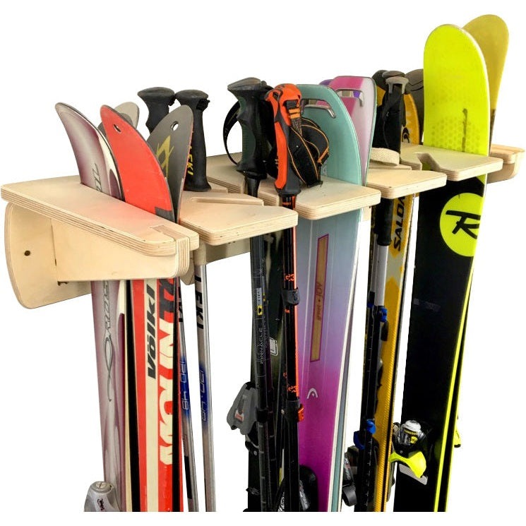 The Ponderosa can hold up to 6 pairs of skis or 5 snowboards with bindings. You can also mix and match skis and snowboards. The Ponderosa gets it's name from it's unique slot system that allows poles to be stored efficiently. This rack comes with 2 hooks for helmets, backpacks, jackets, or any other gear.