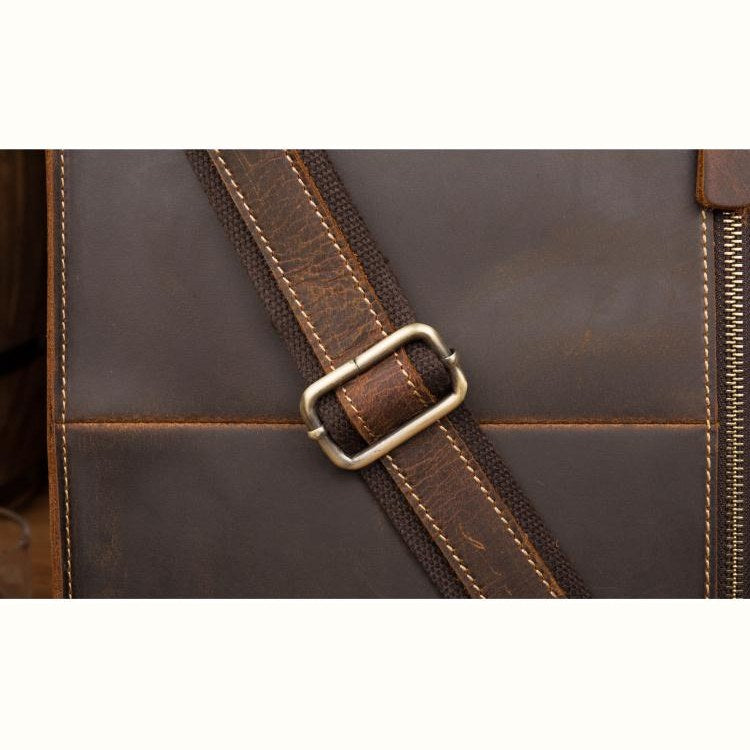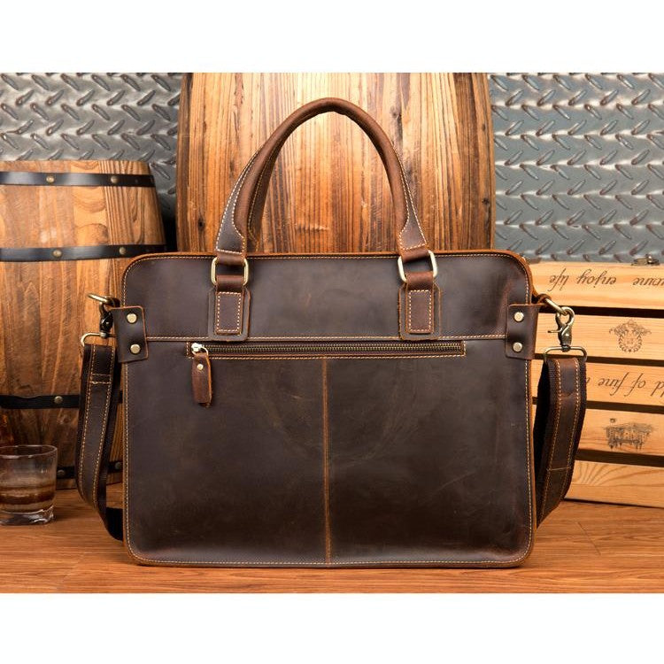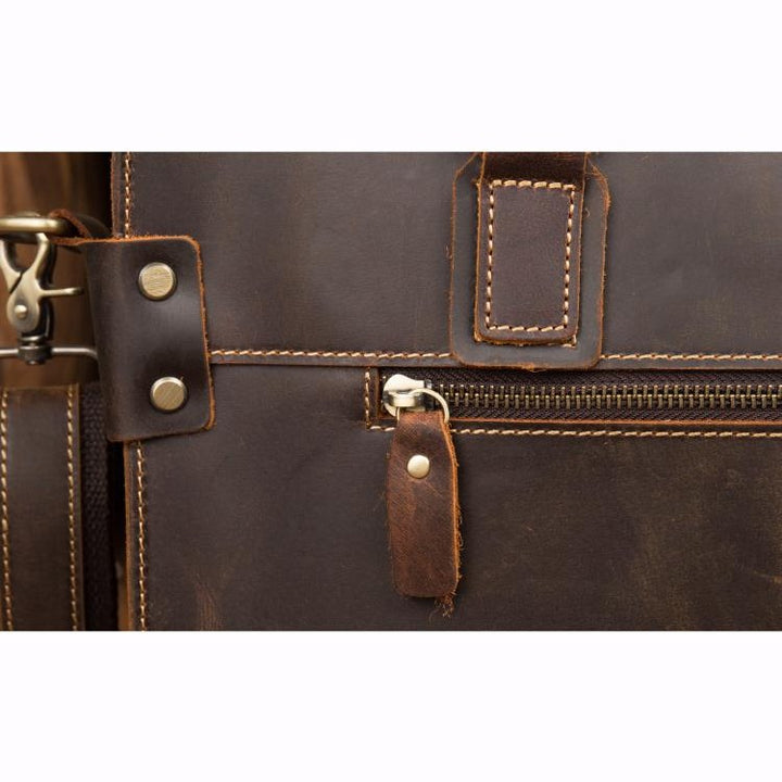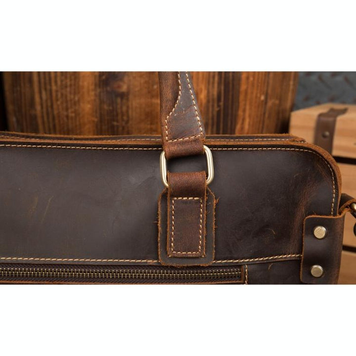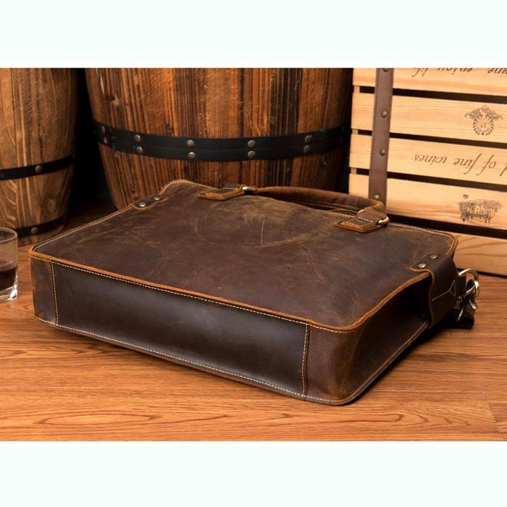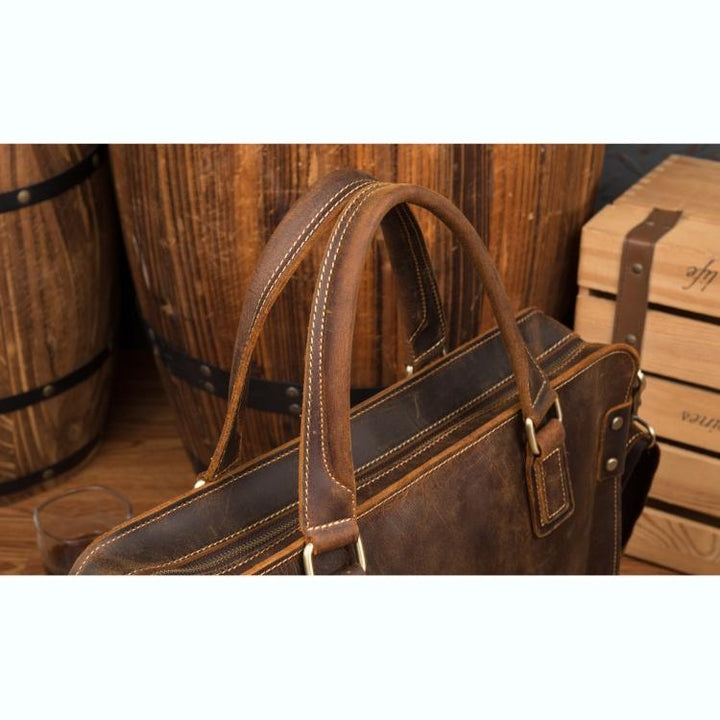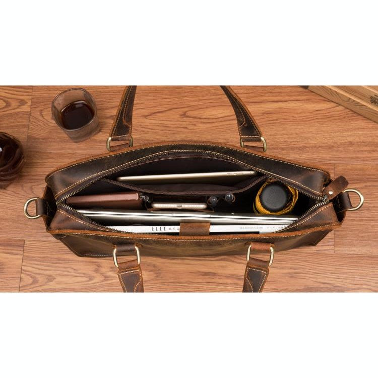 The Viggo Briefcase is designed to efficiently carry items while amplifying your formal look in a corporate environment. This carry companion is an ultimate all-rounder, allowing for belongings to be carried easily and securely, with its sleek arrangement of spacious interior compartments. The briefcase is made of high-quality crazy horse leather, which guarantees a dependable, lasting product, and a natural colour that develops with the passage of time. Laptops up to 14 inches are securely fastened, and further space is ample, making it a perfect carry companion for all your work-related needs.