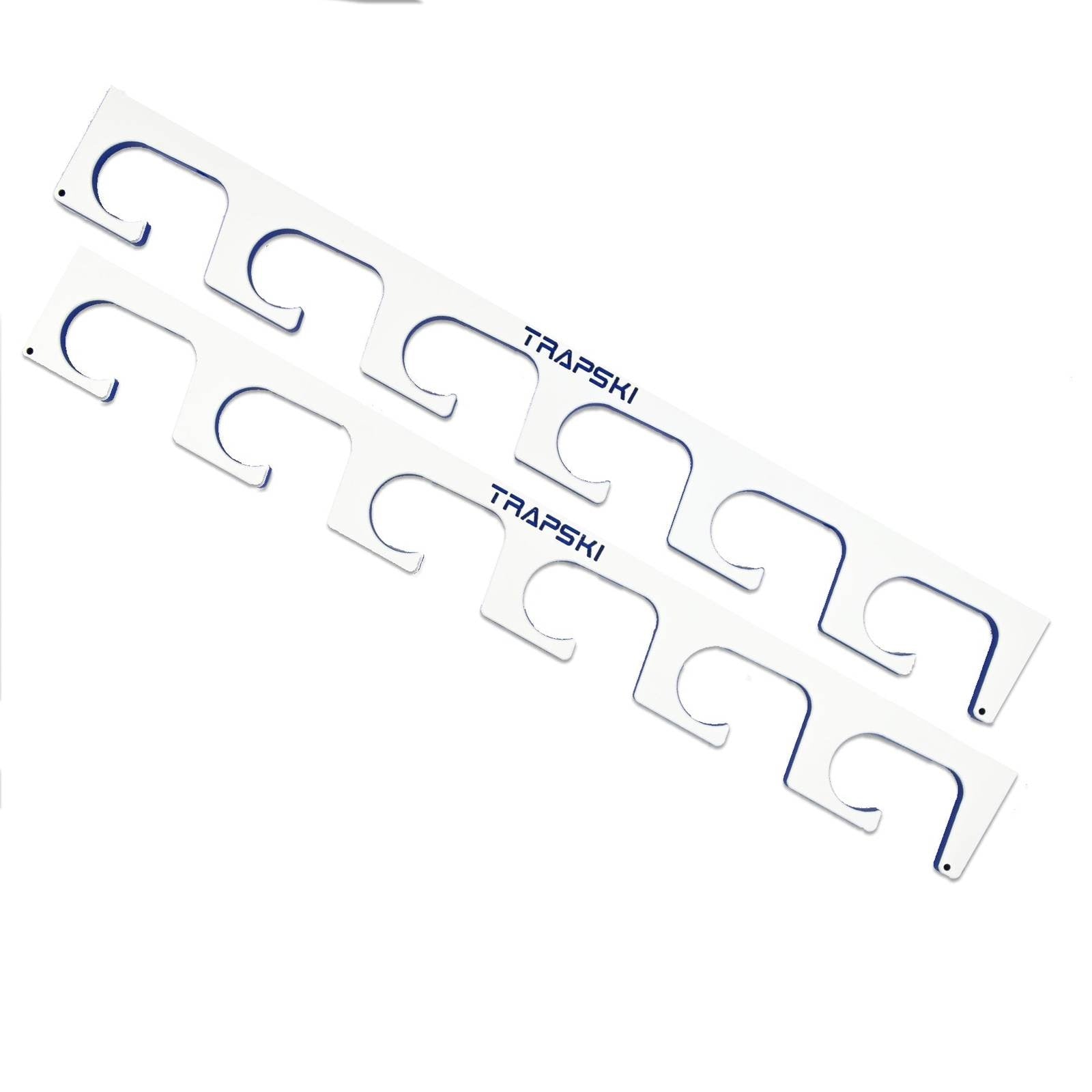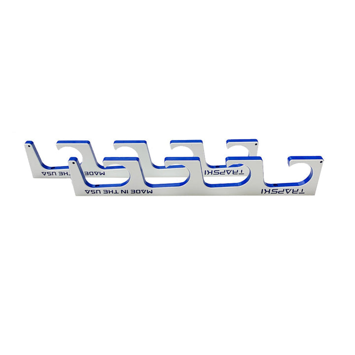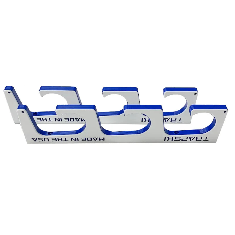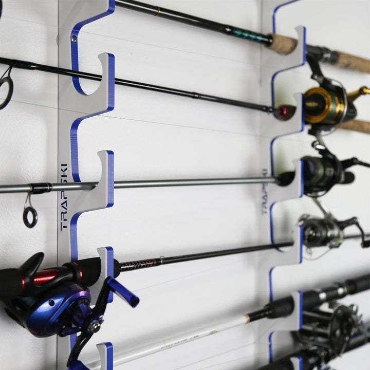 The TRAPSKI Premium Wall Fishing Rod Rack was designed by Angler's for Angler's! Whether you fish the deep sea or your local honey hole, keeping your gear organized and protected is important. It is made with Thick 1/2 inch Marine Grade HDPE in White/Blue/White and comes with Stainless Steel hardware so you can mount it on a wall or ceiling 16 on center in your garage, shed, storage area, boat or outside if you want! The simple design can handle Deep Sea, Inshore or Freshwater rods or combos!