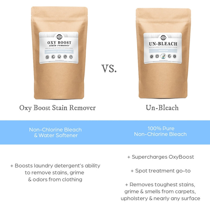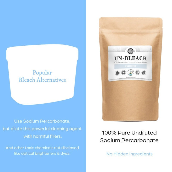 How Un-Bleach works | Un-Bleach is 100% Oxygen Bleach with no fillers like other brands. When mixed with water, it becomes a powerful solution that dissolves your stain’s chemical bonds. Uncovering the original color and brightness, previously dulled by the stain. Surfaces and fabrics are restored to look as good as new!