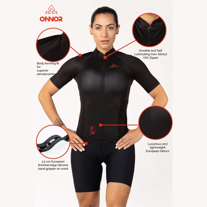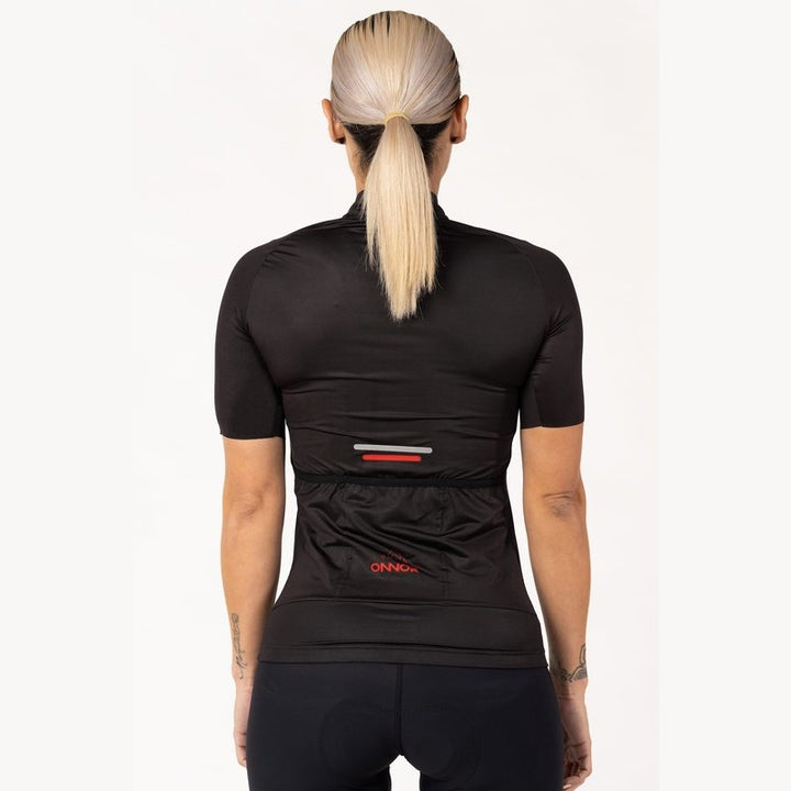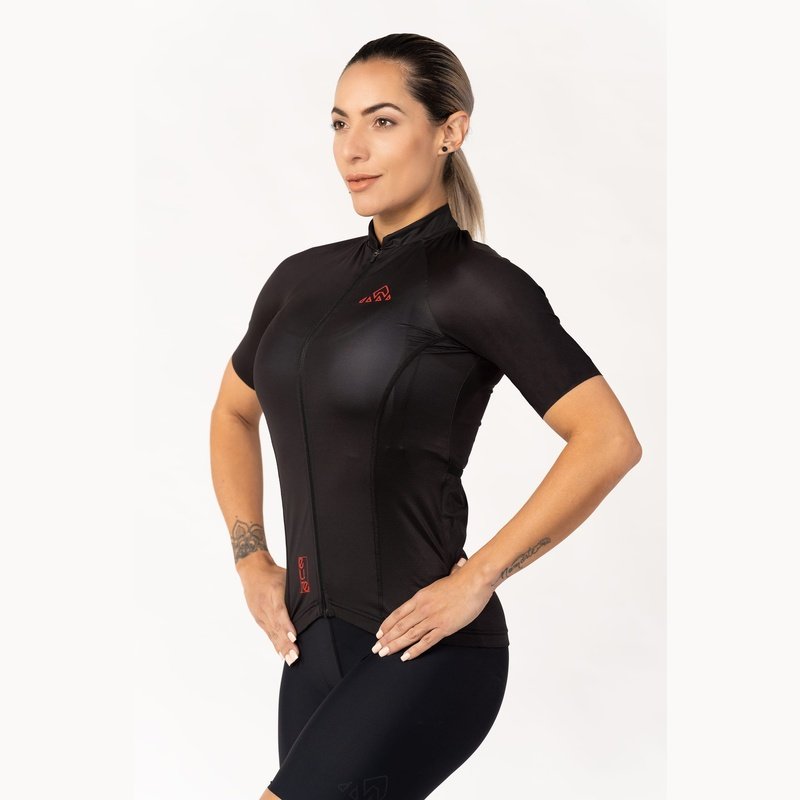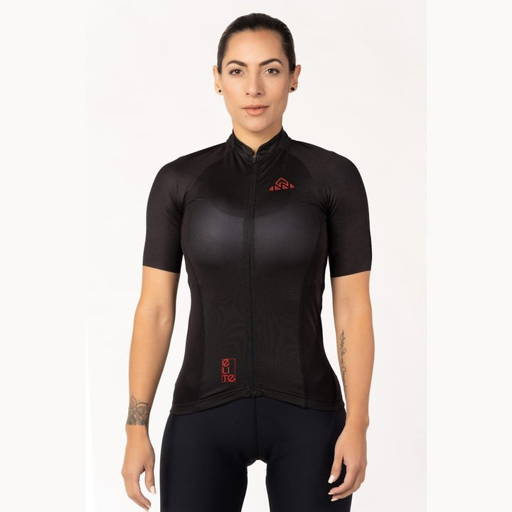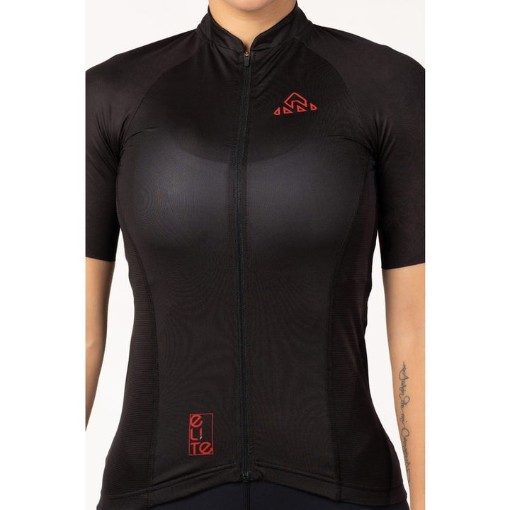Women's Black Elite Cycling Jersey is the perfect choice for when you need maximum comfort and performance. Our Elite Cycling Jersey is intended for those who want a touch of modern design and comfort. The Elite Jersey features an updated collar, rear pocket layout with a fourth waterproof zip pocket, and surge-seam stitching for a clean finish. It is built with soft and comfortable performance fabrics.